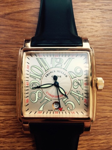 Продается настоящий золотой FrancK Muller Conqistador в очень приличной состоянии,не полирован, из золота на родном ремне,в Москве.Абсолютно любые проверки.Цена -7000 дол США. Торг приветствуется,возможен обмен +доплата .Коробка и доки утеряны.Размер 41*41