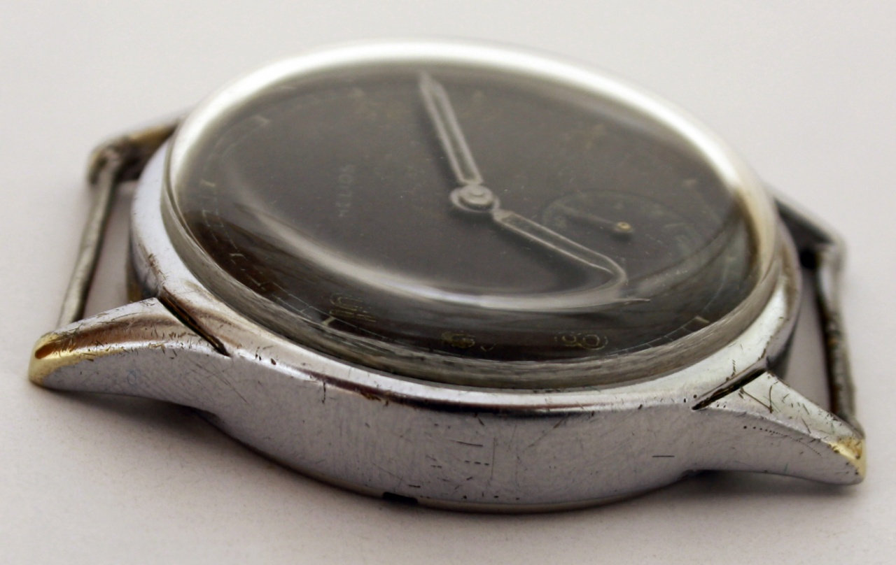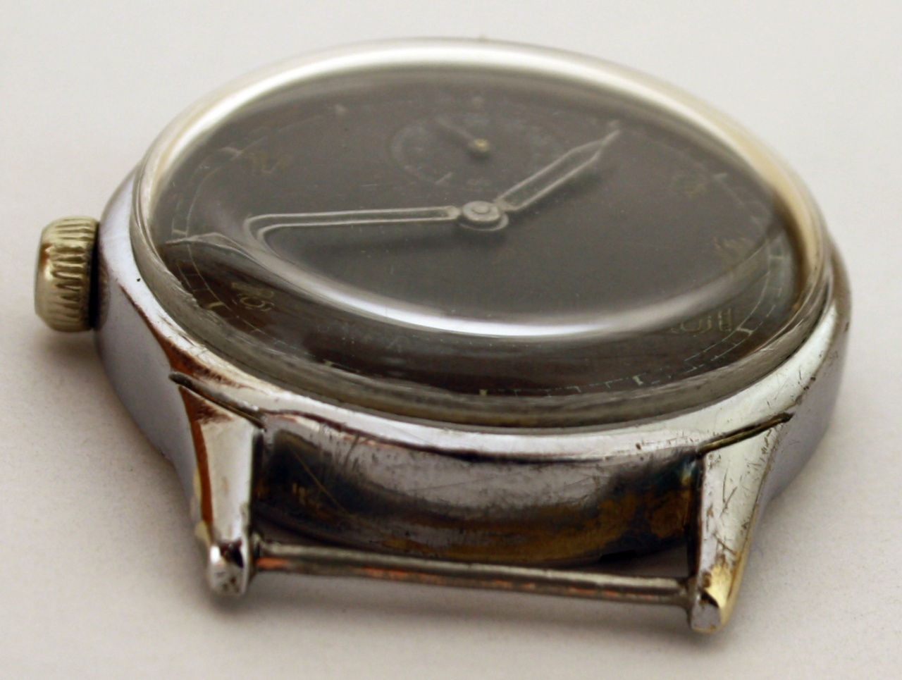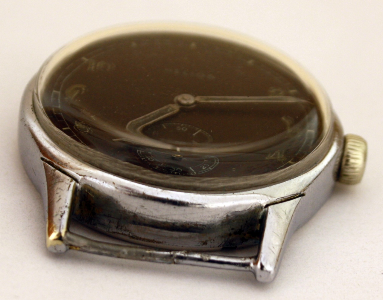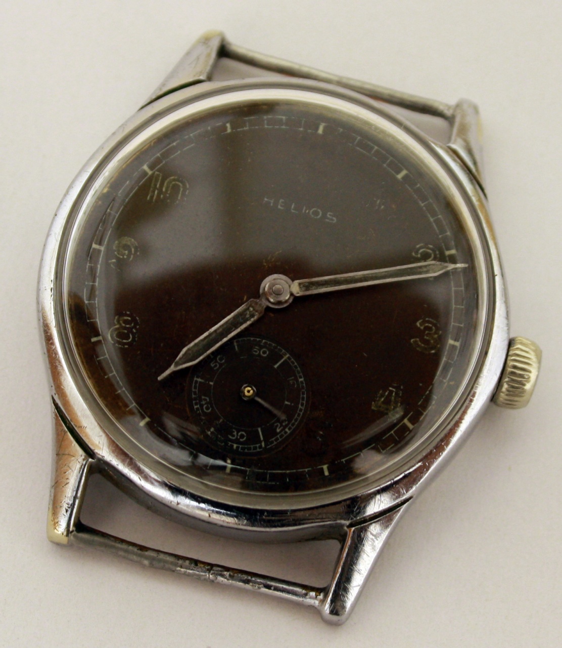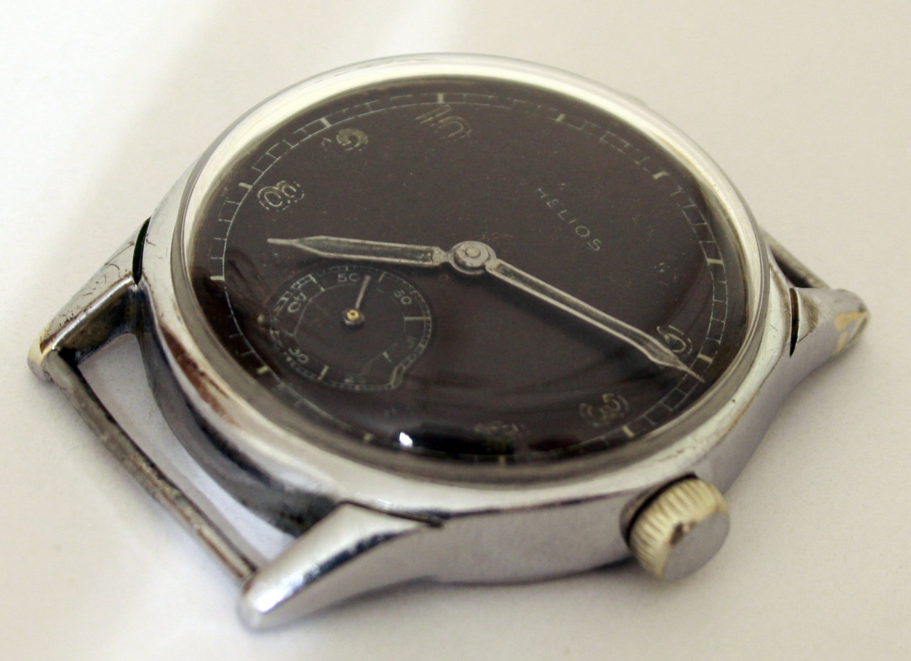 Циферблат: черный, характерный для часов периода второй мировой войны, с арабскими цифрами и надписью Helios. Секундная стрелка боковая.