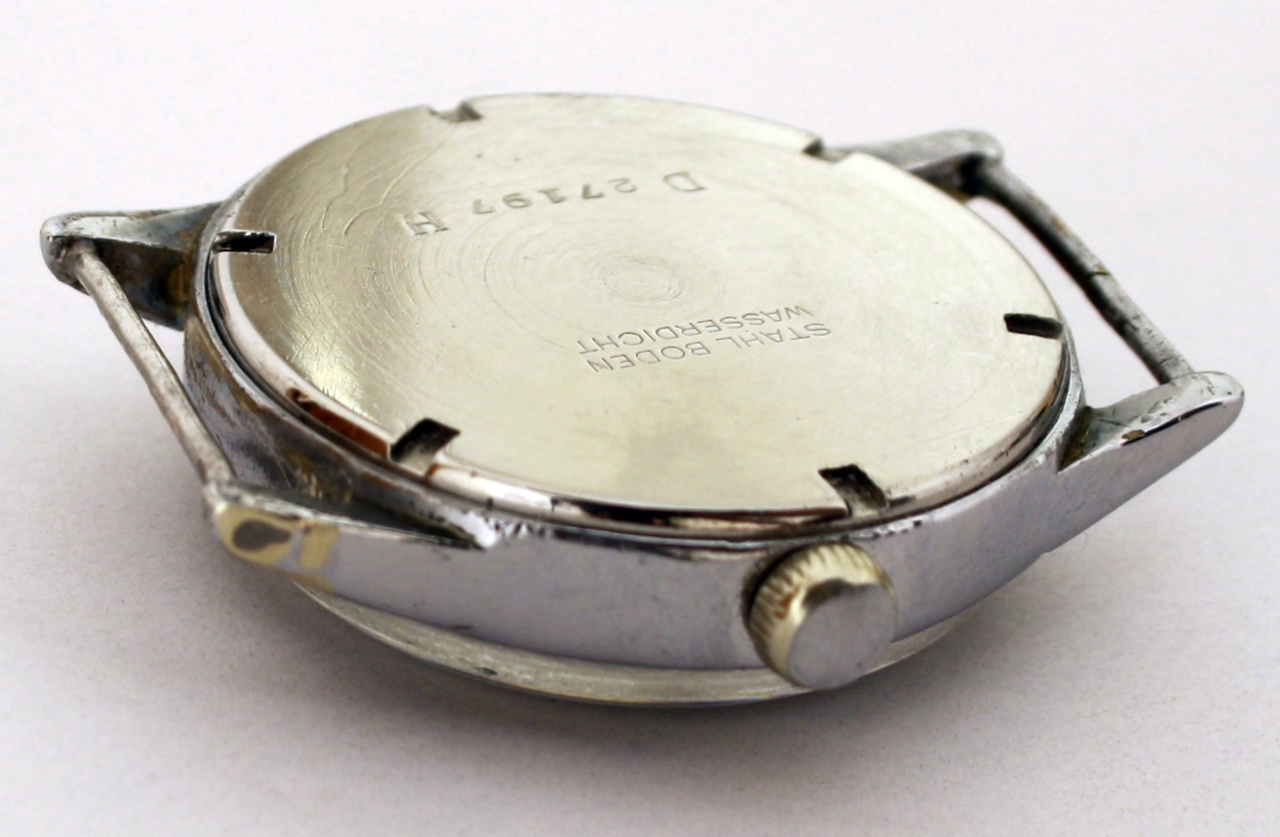 Наручные часы HELIOS DH - находка для любого коллекционера. Рабочее состояние! Подлинные! Задняя крышка выполнена из нержавеющей стали, завинчивающаяся, с клеймом STAHL BODEN Wasserdicht (нержавеющая сталь, водонепроницаемые) и уникальным номером D27197H.