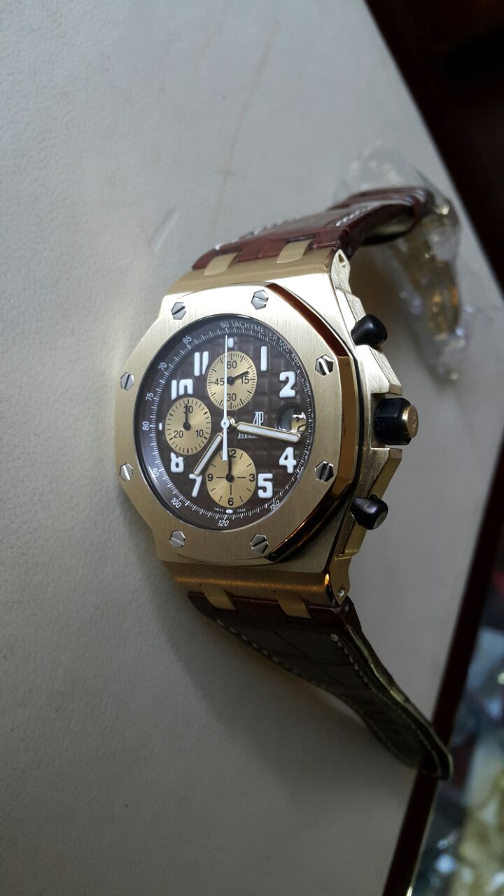 Audemars Piguet Arnold Schwarzenegger ROYAL OAK OFFSHORE LIMITED 400 PIECE Состояние: как новые. Ref. 26007BA.OO.D022CR.01 Механические с автоподзаводом. Корпус: желтое золото. Новый ремень: кожа аллигатора. Диаметр: 44 мм. Гильошированный циферблат. Люминесцентные цифры и стрелки. Винтовой фиксатор головки. 10 атм. Раскладная клипса из желтого золота. 30000 дол. США