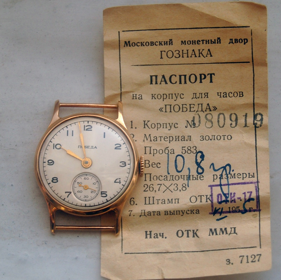 Часики полностью сборные (из того, что было под рукой). Изначально они назывались Победа 1МЧЗ. Потому интереса (как часы) не представляют. Заводная головка тоже не родная, не золотая.