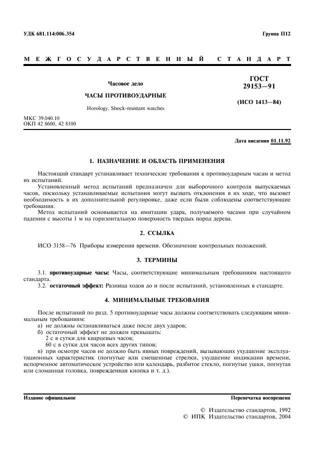 Противоударное устройство оси баланса вроде, как должно спасать сердце механизма - баланс. Но как ни странно иногда, после сильного удара, ломаются или гнутся цапфы оси баланса, причем иногда погнутость очень затруднительно определить, но из-за нее скажем, часы в горизонтальном работают отлично, а при носке периодически встают. Был у меня даже случай, когда палета вылетела с анкерной вилки, а балансу хоть бы что, зашелачил обратно, и ходит мой восток 2214 по сей день. Существуют ли какие-то нотмативы, на ударопрочность часов , к примеру , при падении с полуметровой высоты механизм гарантировано должен держать удар, или все же их нет( ведь понятно, что после падения с метровой высоты на бетонный и деревянный пол последствия различны)? Хотелось бы знать их, чтобы можно было сразу предположить вероятную неисправность