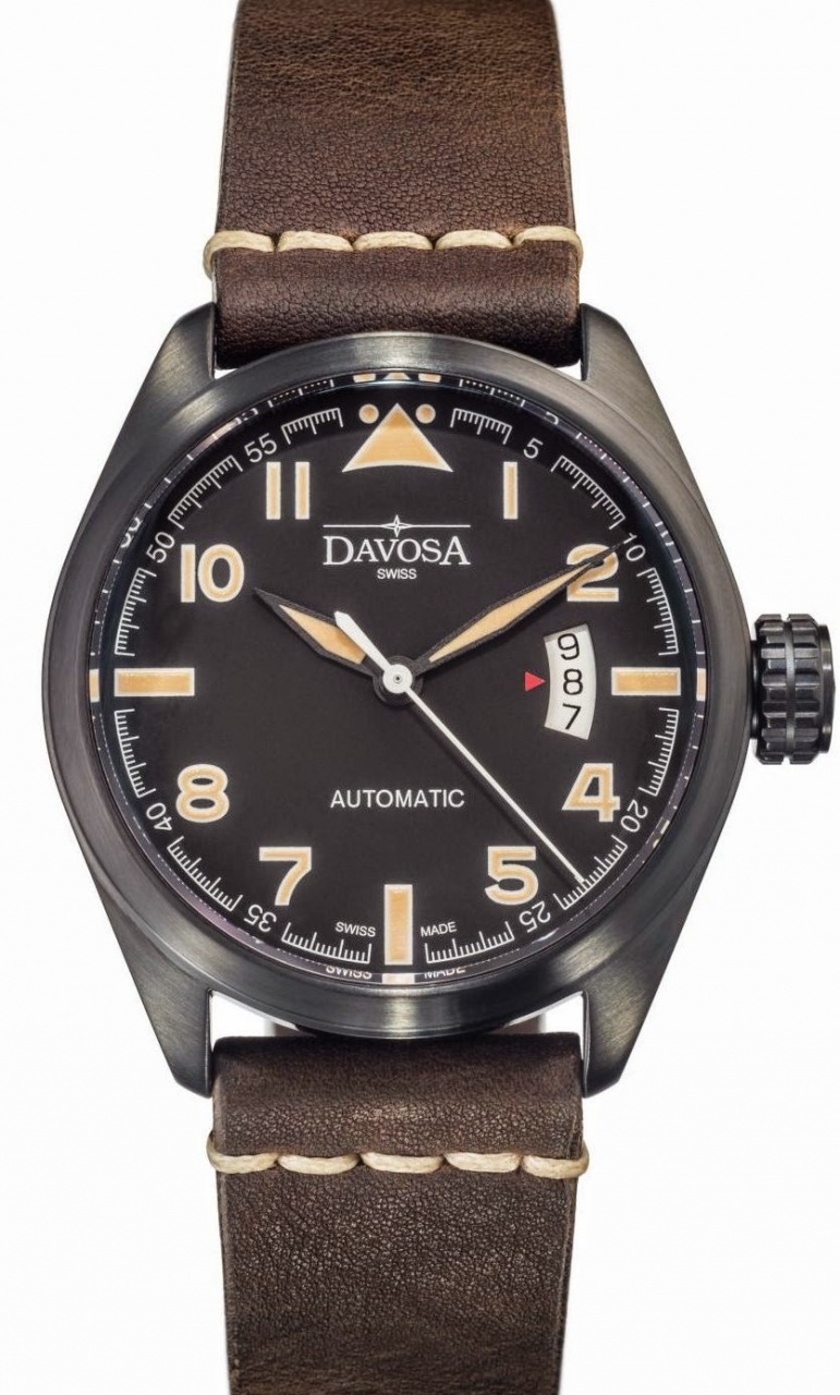 Круглый корпус новинки, изготовленный из нержавеющей стали с черным PVD-покрытием, диаметром 42,0 мм, толщиной 12,8 мм, водонепроницаемый до 200 метров. На торце крупной завинчивающейся рифленой заводной головки, расположенной на 3 часах, выгравировано изображение эмблемы бренда DAVOSA. Задняя крышка часового корпуса глухая, гравированная, завинчивающаяся. Выпуклое сапфировое стекло с антибликовым покрытием защищает циферблат матово-черного цвета, с арабскими цифрами, часовыми индексами, часовой и минутной стрелками, покрытыми люминесцентным составом Superluminova винтажного песочного цвета, имитирующего радиевое покрытые, применявшееся на военных часах в 30-40 годах прошлого столетия.