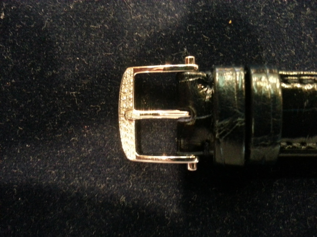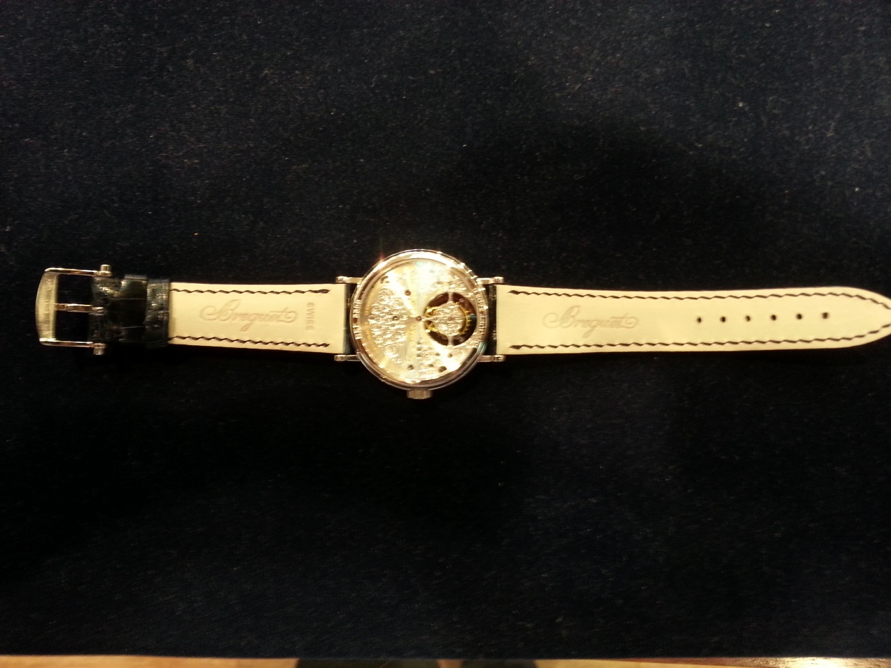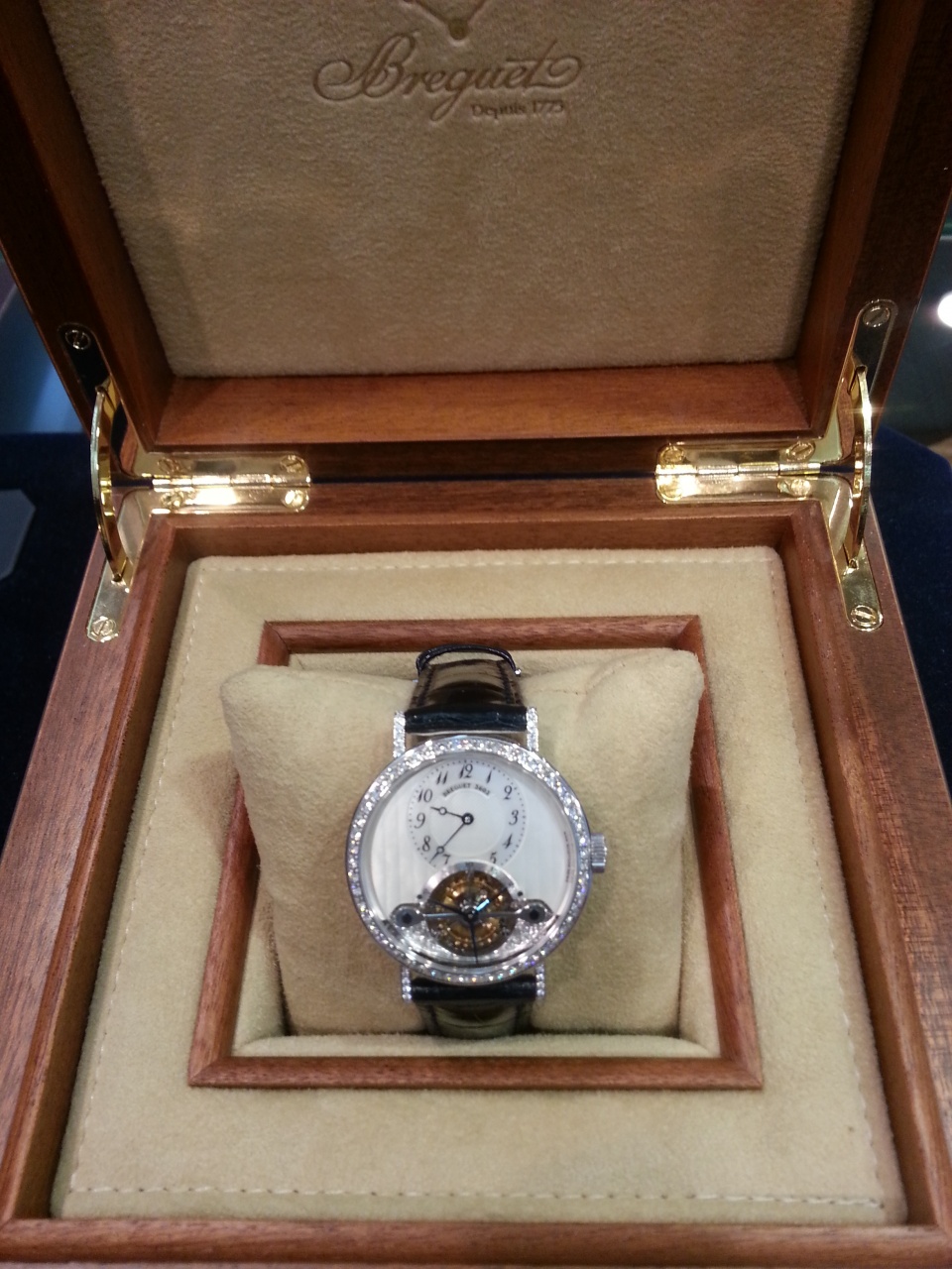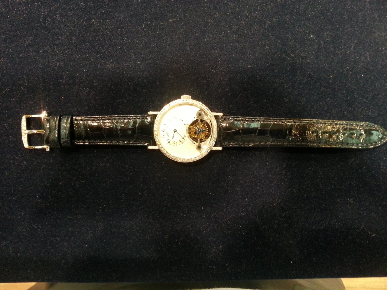 Breguet 3358 Classique Grande Complication. С турбийоном. Женские. Состояние: идеальное, как новые. НЕ полированные. Материал корпуса: белое золото 18К. Механизм с ручным заводом. Малая секундная стрелка на оси турбийона. Автокомпенсирующая спираль Breguet. Безель и «ножки» украшены 74 бриллиантами (около 1,33 карата). Стекло сапфировое с антибликовым покрытием. Задняя крышка из сапфирового стекла. Циферблат с гильошированым вручную узором. Размер корпуса: 35 мм. Водонепроницаемость: 30м. Запас хода: 50 часов. Новый ремень из кожи аллигатора. В комплекте с коробкой. Цена: 57000 $.