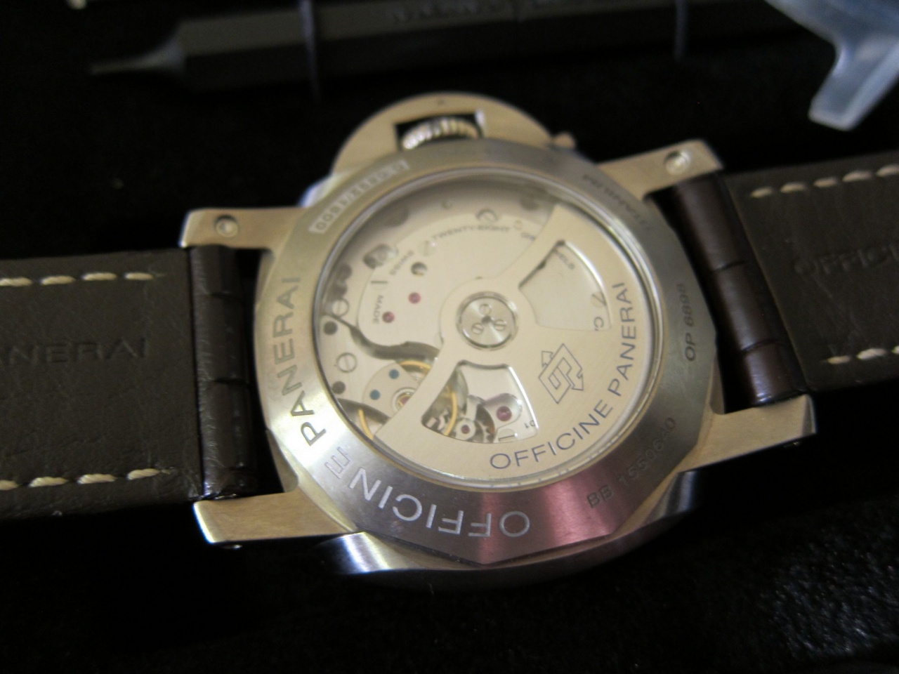 МЕХАНИЗМ: Автоматический механизм, калибр Panerai P.9000, производство Panerai, 13¾ линии, толщина 7,9 мм, 28 камней, баланс из сплава Glucydur®, 28 800 полуколебаний/час. Противоударное устройство Incabloc®. Запас хода 3 дня, два заводных барабана. 197 деталей.