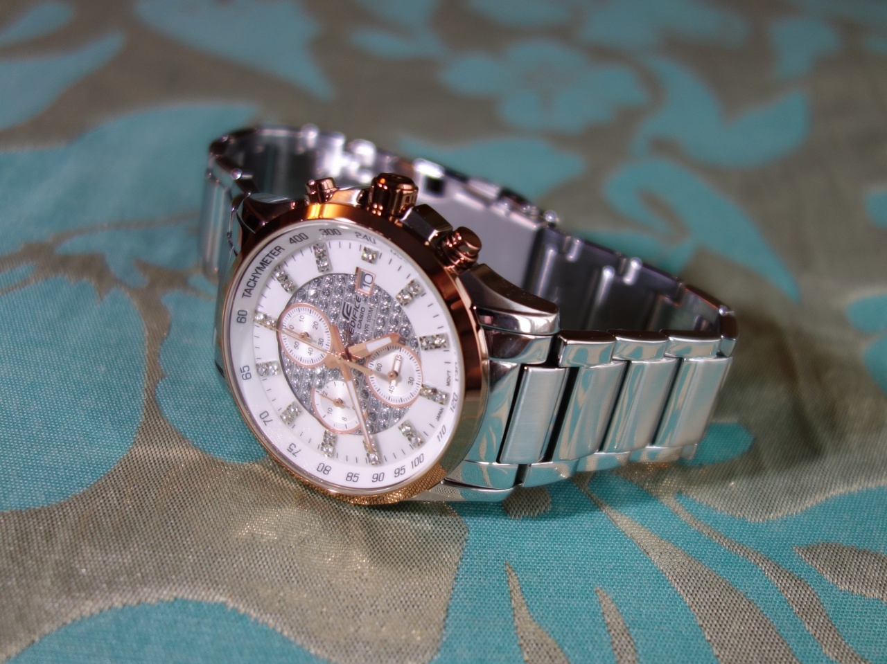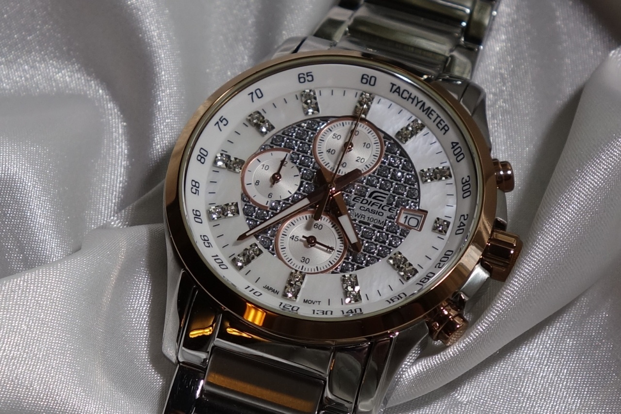 В продаже редкая модель кварцевого хронометра Casio Edifice. Циферблат часов перламутрового цвета инкрустирован кристаллами.