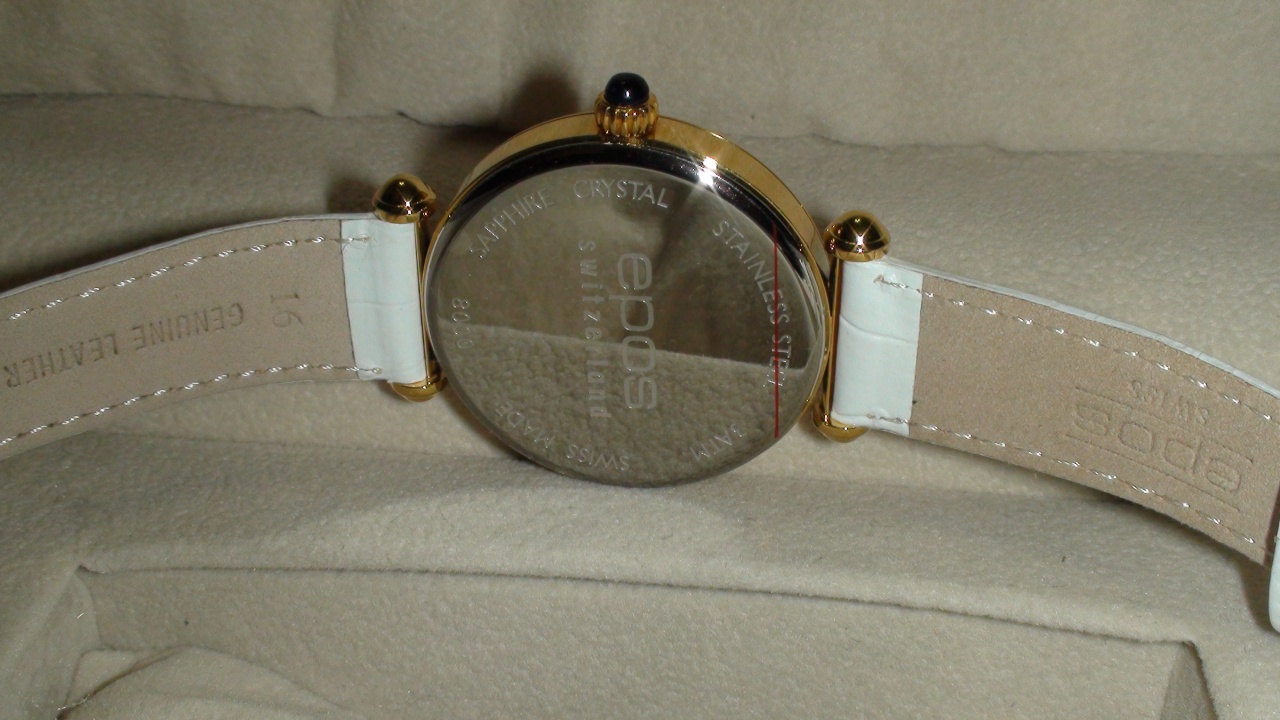 Элегантные женские часы швейцарской фирмы Epos на белом кожаном ремешке.