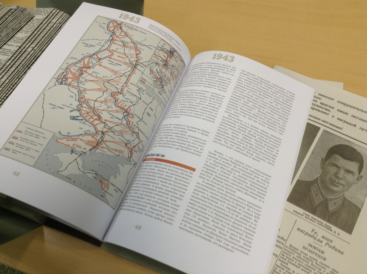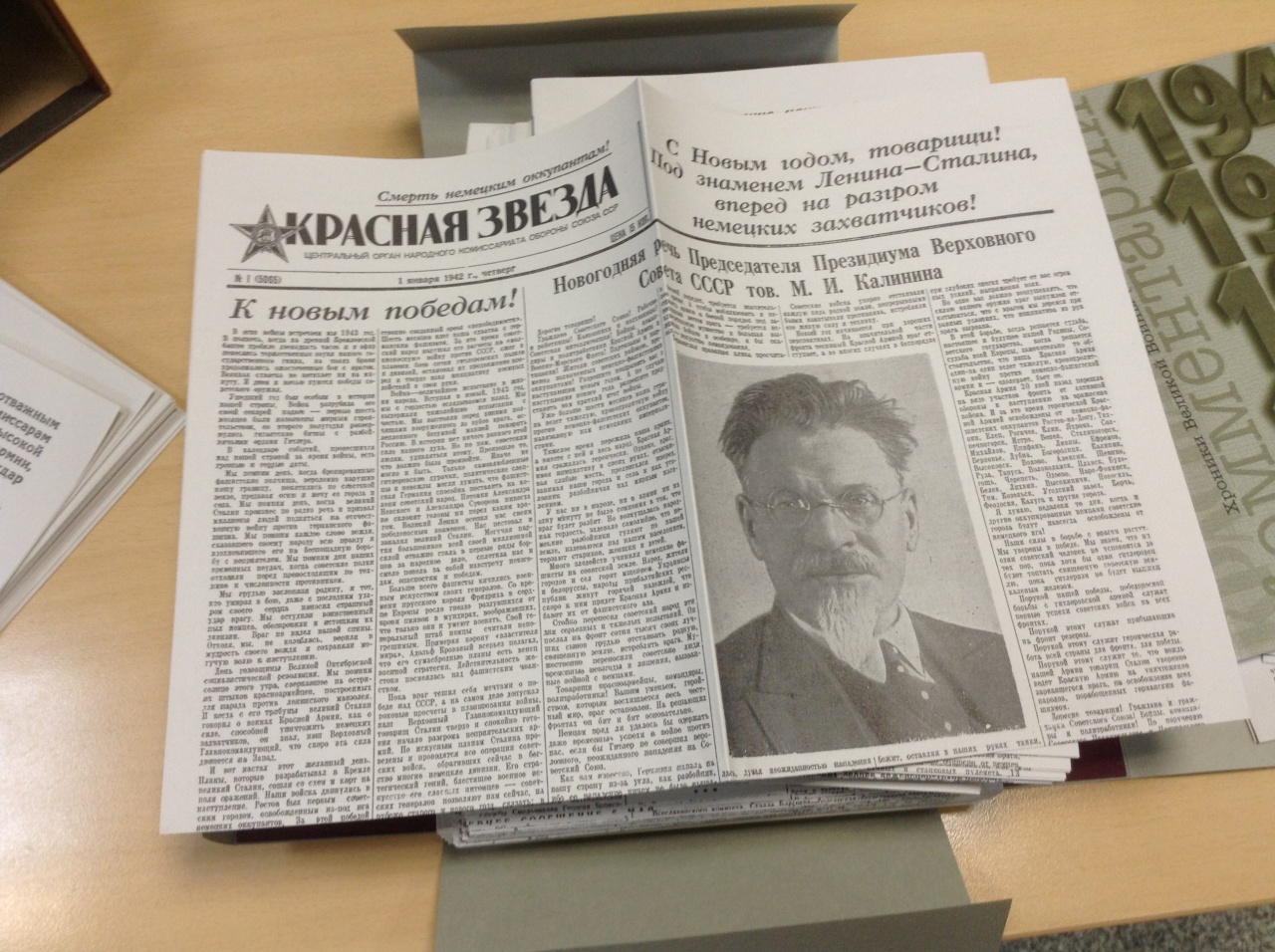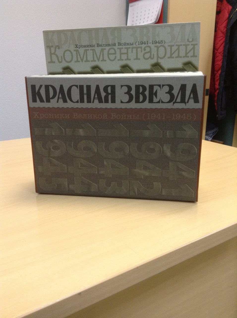 в виде 100 выпусков газет "Красная Звезда", изданных в годы Великой Отечественной Войны. Для большинства из нас, а тем более детей, внуков... быть может, впервые в жизни-увидеть , какой именно была фронтовая "Красная Звезда", попытаться в ХХI веке ощутить то, что испытывал пехотинец, танкист, летчик, читая в свежем номере газеты грустные сообщения с фронтов, повторяя про себя названия оставленных Красной Армией городов и сел...и радостные заметки о переломе, наступлениях,.. в конце о Великой Победе и окончании Войны...