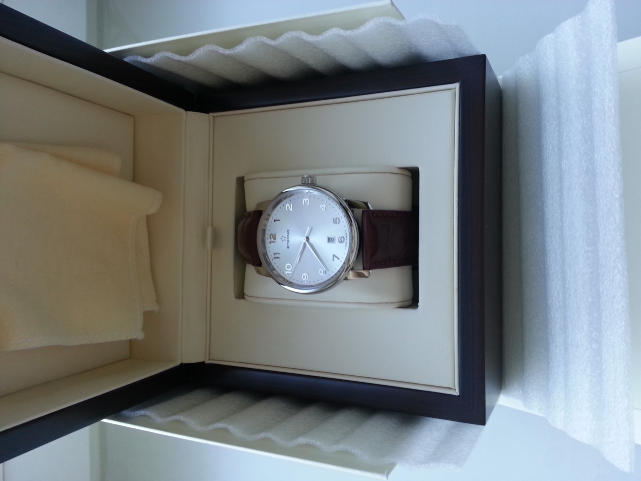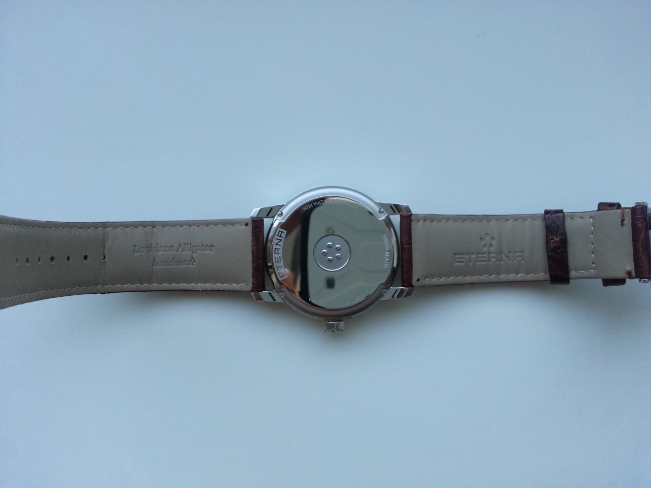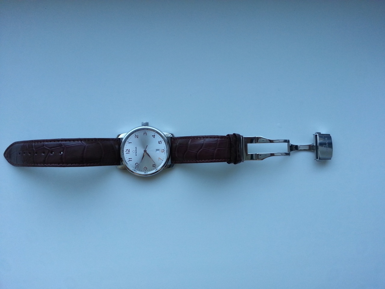 Полированный корпус, коричневый ремешок, светлый циферблат и арабские цифры: строгость и элегантность. Ремешок крокодил на застежке бабочке. Отличные костюмные часы как на работу так и на вечер.