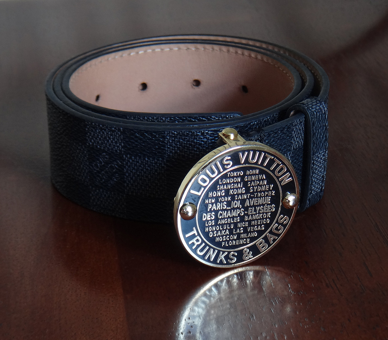 Материал: канва Damier Graphite (серая шашка). Круглая пряжка золотого цвета, стилизованная под исторический логотип Louis Vuitton Trunks and Bags. Материал пряжки: латунь и черная эмаль.