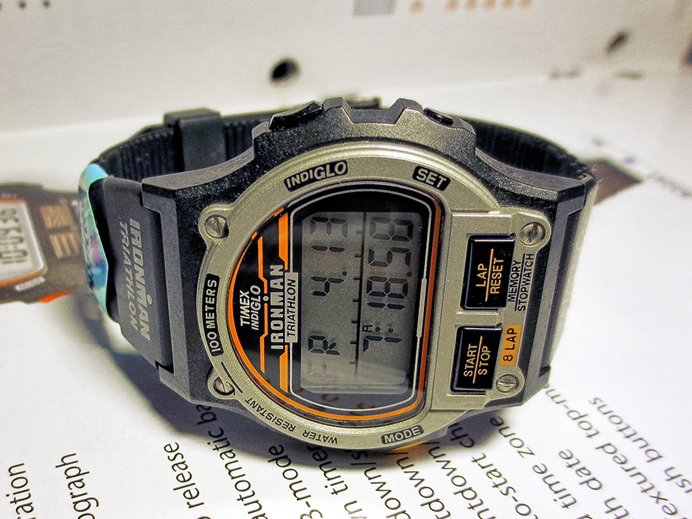 Продаю легендарную классическую модель Timex Ironman Triatlon. Модель 77121 филиппинского производства. Т.н. вариант NOS - new old stock. Часы новые, с коробкой, подставкой и бумагой - но только выпуска конца 1996-го года. Всё работает, подсветка индигло светится, пищалка пищит, секундомер бегает. Производитель обещает 100м водонепроницаемости, будильник, 8-lap секундомер и ещё разной ерунды по мелочи...