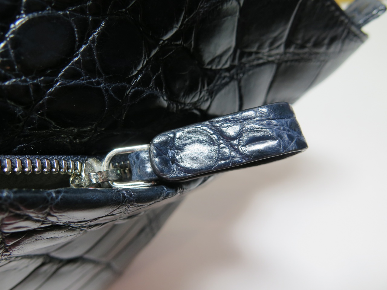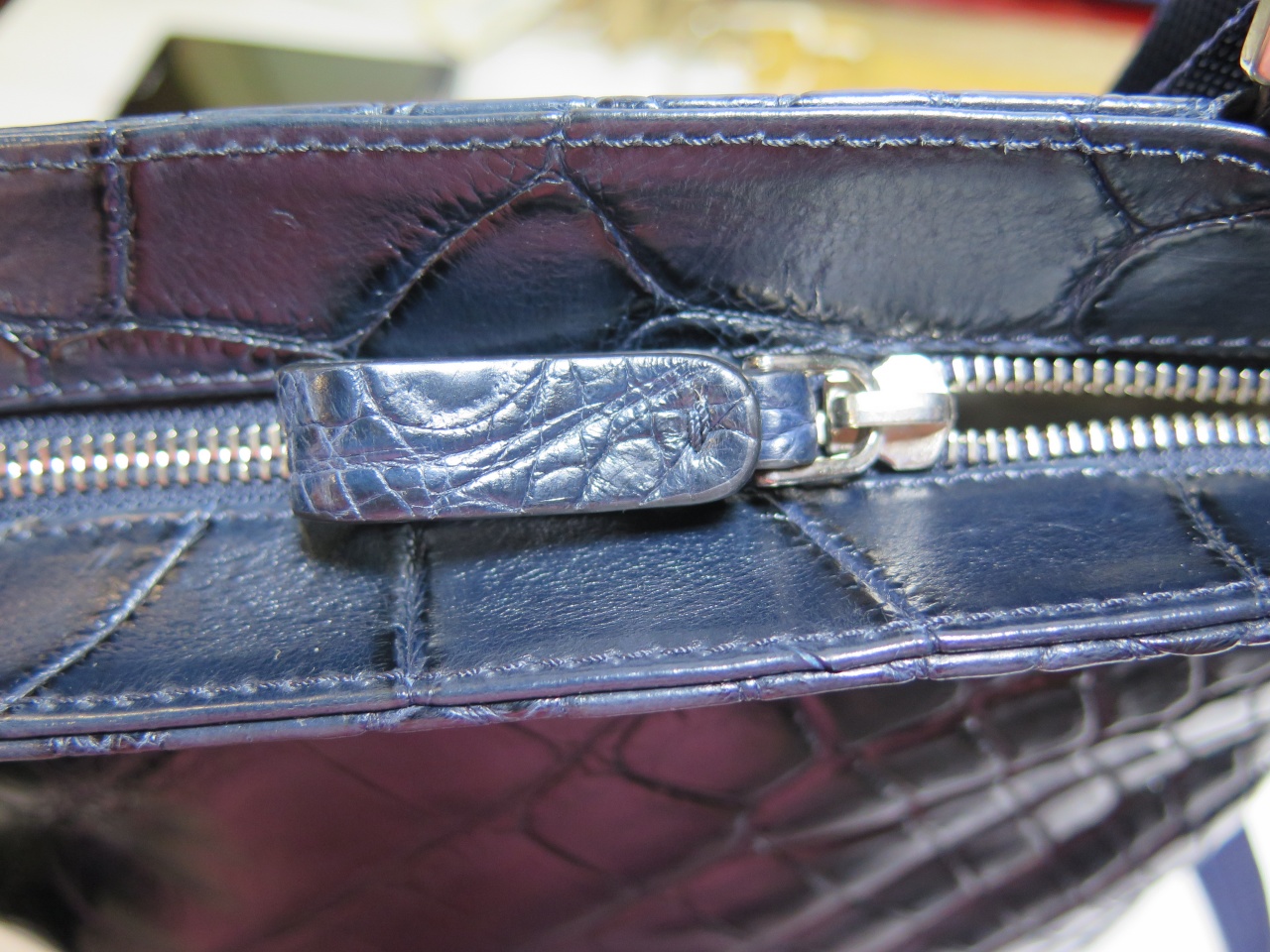 Сумка застегивается на серебристые молнии с бегунками из кожи аллигатора и имеет снаружи два дополнительных отделения на молнии (спереди и сзади).