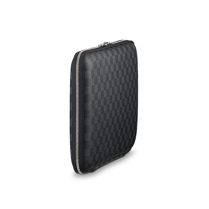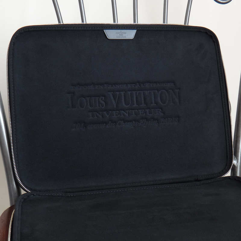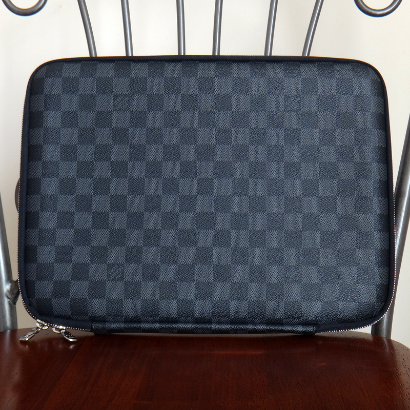 Канва Damier Graphite (серая шашка). Закрывается на молнию с двумя бегунками. Подкладка черного цвета, амортизирующий мягкий материал.