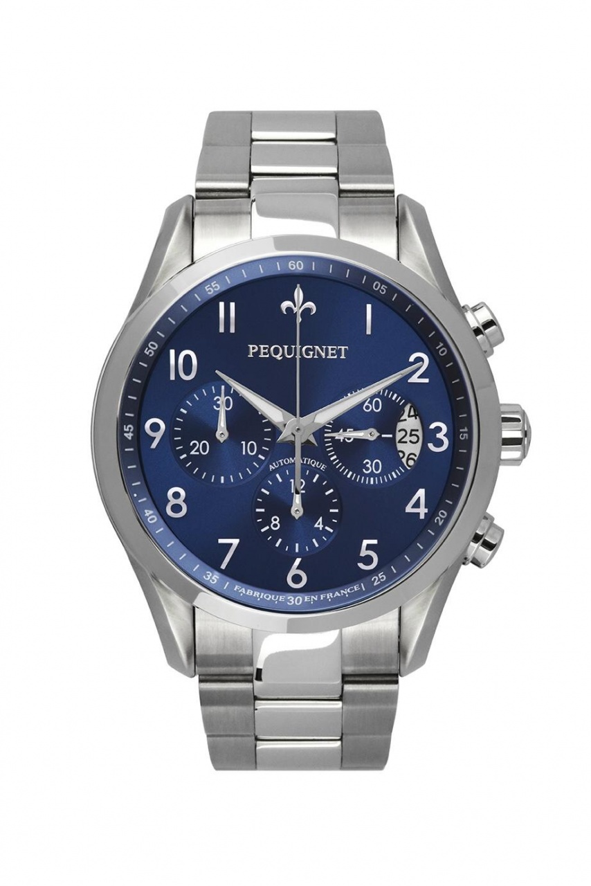 Круглый корпус новинки, изготовленный из нержавеющей стали, диаметром 42,0 мм, водонепроницаемый до 100 метров. На торце завинчивающейся рифленой заводной головки, расположенной на 3 часах, выгравирована эмблема бренда Pequignet. Пушеры хронографа размещены на 2 и 4 часах. Сапфировое стекло защищает серебристый, черный или синий циферблат с лучистой отделкой, с накладными арабскими цифрами, а также с часовой и минутной стрелками, покрытыми люминесцентным составом SuperLuminova белого цвета.