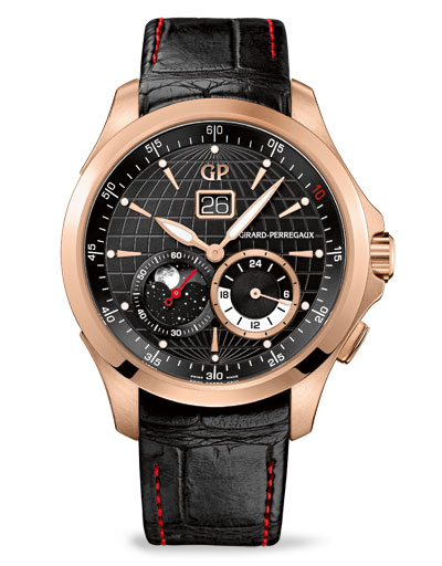 Модель оснащена мануфактурным швейцарским автоматическим механизмом Girard-Perregaux GP03300-0095, диаметром 30,40 мм, на 35 камнях, с балансовой частотой 28800 полуколебаний в час (4 гц), 46-часовым запасом хода, с функциями индикации часов, минут (посредством соответствующих центральных стрелок), секунд (на соответствующем малом боковом циферблате, расположенном между 7 и 8 часами), даты (посредством соответствующего цифрового указателя в большой прямоугольной апертуре, расположенной на 12 часах), фаз Луны (посредством соответствующего круглого указателя, в виде звездного неба с Луной, совмещенного с малым боковым секундным циферблатом), а также времени второго часового пояса (посредством соответствующего круглого аналогового указателя с 24-часовой разметкой, с индикацией "дня/ночи", расположенного между 4 и 5 часами). Калибр отменно отделан и декорирован.