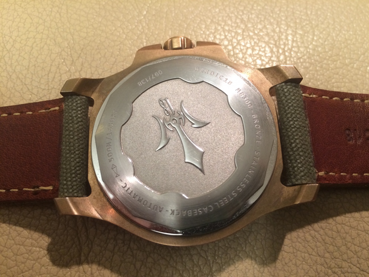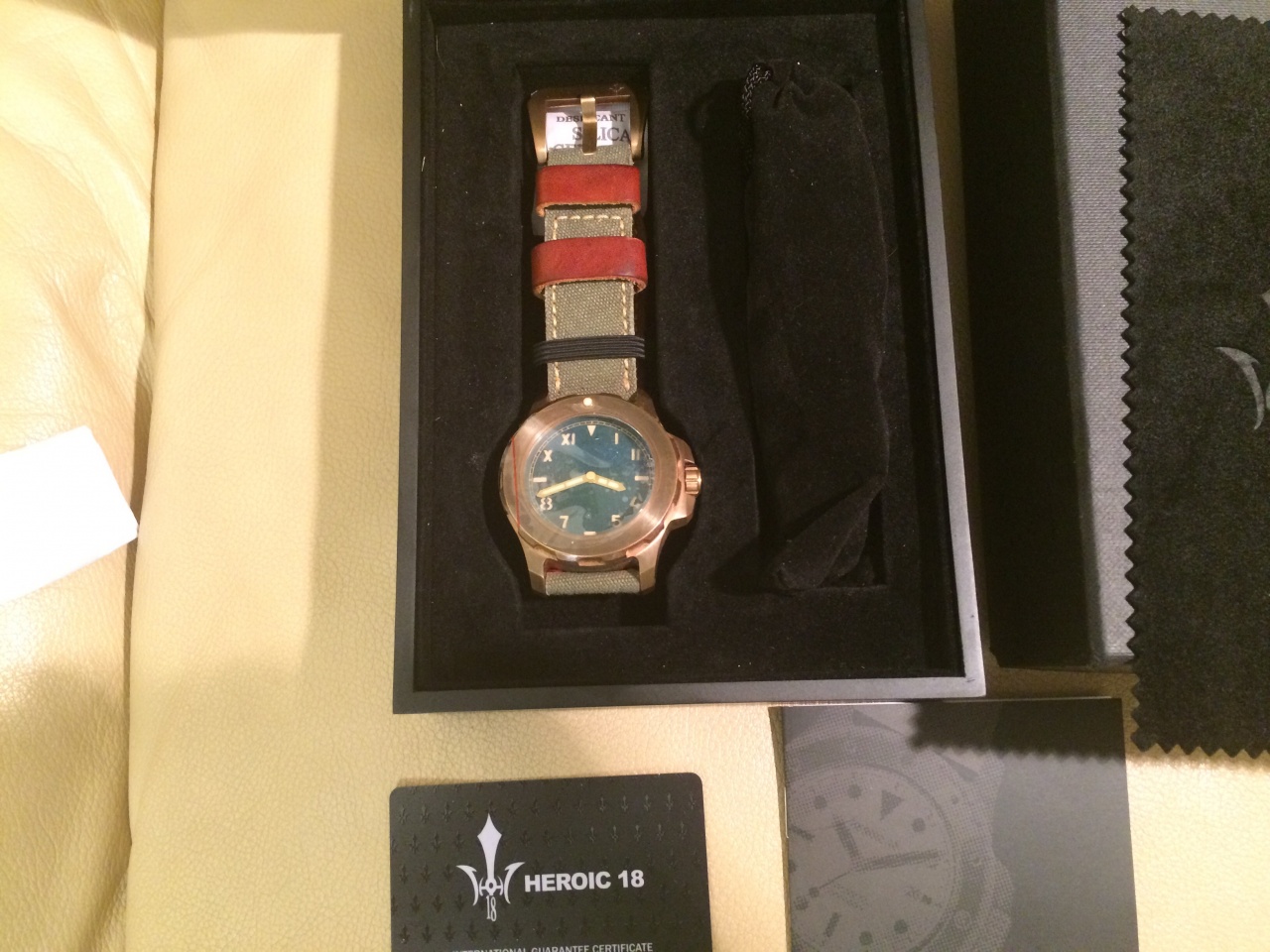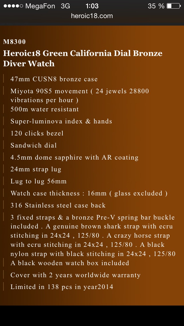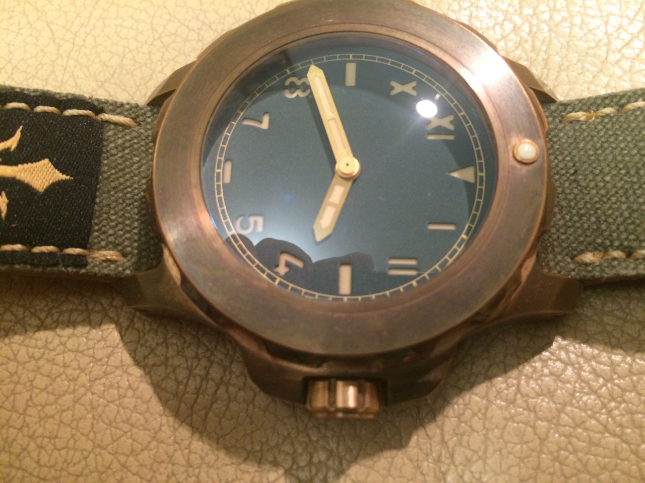 Продам настоящие бронзовые часы.Не купались,куплены через известного форумчанина по предзаказу.Лимитка 138 штук.Сейчас все распроданы.На момент покупки в Штатах стоили 899 долларов+налог.Оригинальные комплектные ремни-новые.При покупке был куплен ориг.ремень из зеленой парусины стоимостью 155 долларов(стоит на часах).Магазинный комплект.Носил недели 2-3, понял, что при том кол-ве,что у меня в сете-лежат без дела в виндере и занимают место.Водостойкость-500 метров.По предоплате на карту сбера отправлю за свой счет.