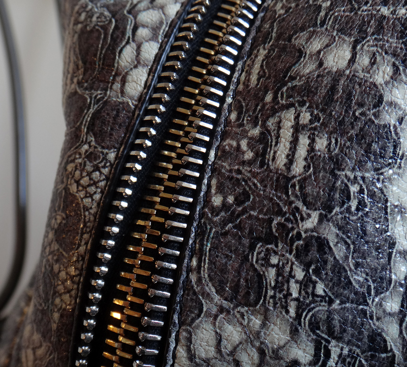 Еще одна фирменная фишка Prada, использованная в данной сумке, это сдвоенная молния (как бы одна молния вложенная в другую: одна функциональная, вторая декоративная) - одна молния серебряного, другая золотого цвета. Таким образом сумка подходит под аксессуары из любого металла.