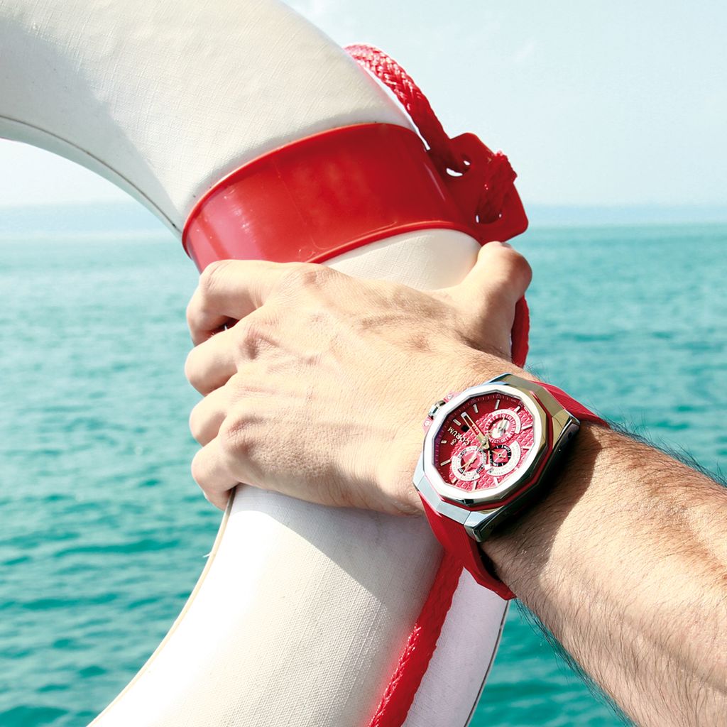 Поставляется на красном текстурированном ремешке из вулканизированной резины.