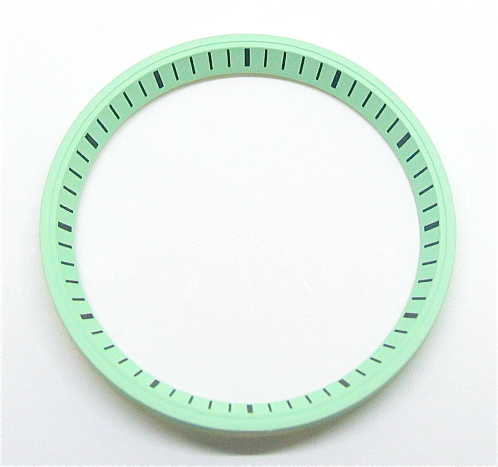 - Минутное кольцо (для примера есть отдельно на картинке зеленого цвета), которое стоит между стеклом и циферблатом имеет люфт около 1-1,5 мм по окружности, если резко качнуть часами.