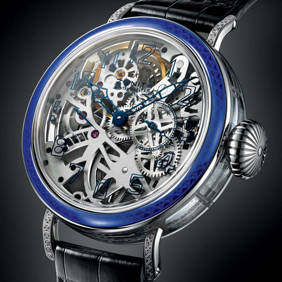 Новая лимитированная модель Pilot Type 20 Squelette от одного из грандов швейцарской часовой промышленности Zenith имеет круглый корпус, изготовленный из сапфира с каркасом из 18-каратного белого золота, диаметром 60,0 мм, толщиной 18,5 мм, водонепроницаемый до 30 метров. Крупная рифленая заводная головка, выполненная в форме луковицы, расположена на 3 часах. Она, так же, как и фиксированный безель и дужки корпуса, выполнена из 18-каратного белого золота и покрыта вручную выполненной гравировкой. Безель покрыт сапфиром с синим эмалированием. Сапфировое стекло установлено на передней стороне часового корпуса и на его завинчивающейся задней крышке. Циферблат также сапфировый, с синими арабскими цифрами и с воронеными золотыми стрелками (в том числе, часовая и минутная - скелетонизированные.
