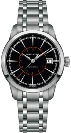Круглый полированный корпус новинки, изготовленный из нержавеющей стали, диаметром 40,0 мм. На торце рифленой заводной головки, расположенной на 3 часах, выгравирован логотип бренда Hamilton. Сапфировое стекло с антибликовым покрытием защищает матово-черный или серебристый циферблат с накладными продолговатыми гранеными стальными часовыми индексами и стрелками. На периферии имеется круглая минутная разметка, а вокруг его центральной части - двенадцатичасовая круглая шкала, выполненная в красном или в синем цвете. Модель оснащена швейцарским автоматическим механизмом Hamilton Н-10, с 80-часовым запасом хода, функциями индикации часов, минут, секунд (посредством соответствующих центральных стрелок) и даты (посредством соответствующего цифрового указателя в прямоугольной апертуре, расположенной на 3 часах).