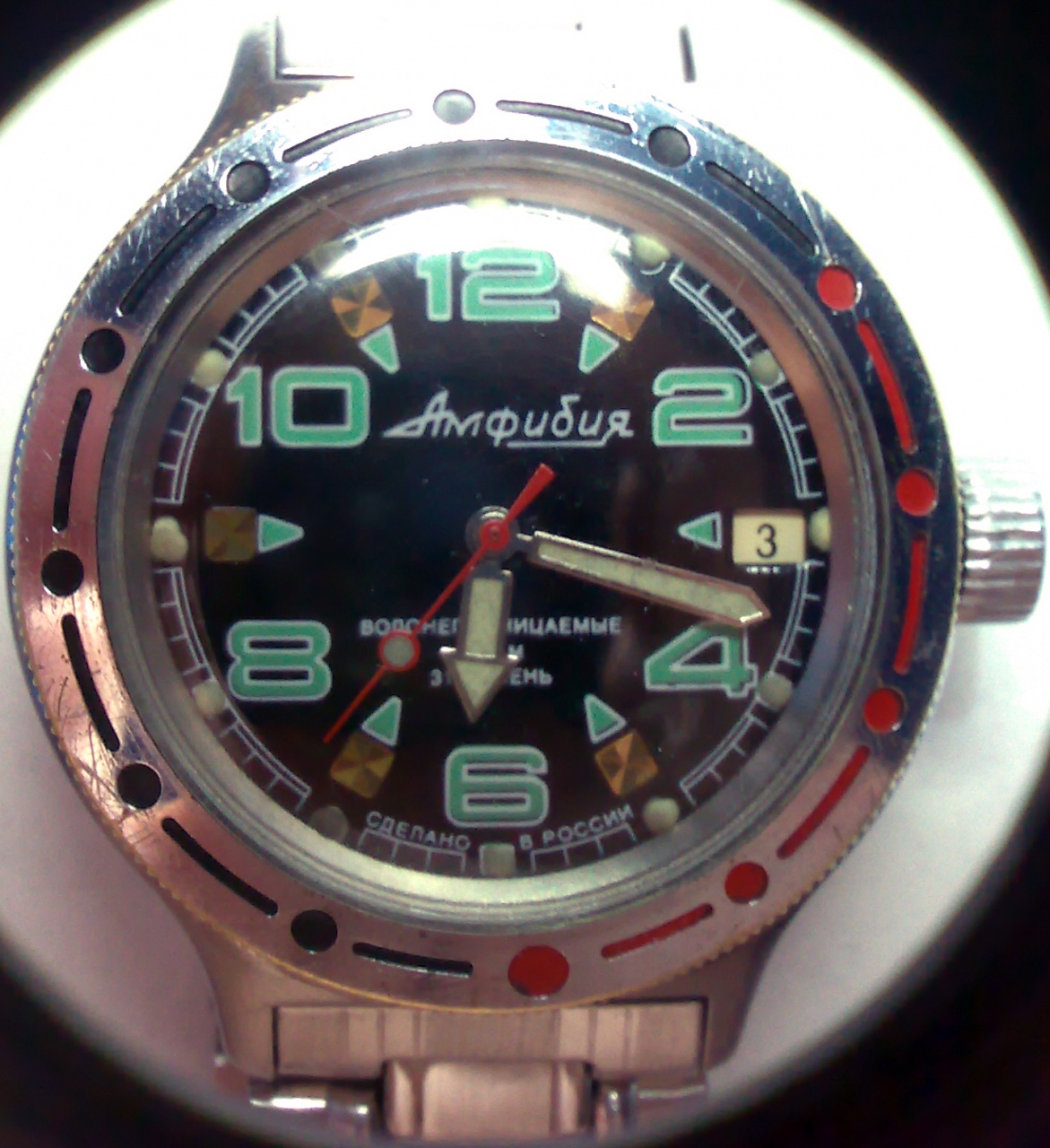Иначе у меня точно такая Амфибия есть (только стрелки другие как сказал). Ходит очень точно - +2сек/24ч. Восток 2416Б имеет настоящие 31 камня, просто 10 из них (2х5) ползуются как шарикових лагерей в обе реверсивних колесах автоподзавода. Безел не кликает, вращается свободно в обе посоках.