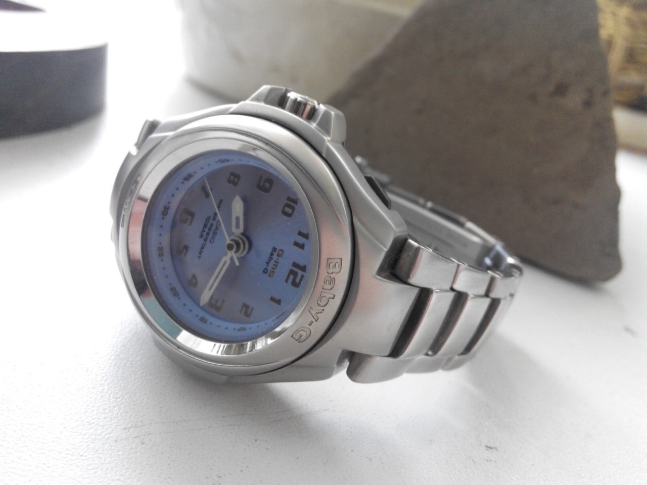 Вот я в этот раз. Хотел купить что скромное, локоничное, но в нашем духе))) Порывшись в современном, не обрадовался. Все пластиковое или с кучей окошек-экранчиков. Короче лабуда. Стал рыть барахолки. Конечно все только в состоянии "минт-кондишен" или "на 5". И очень загорелся вот такой, называются много и долго Baby-G G-MS MSG - 510. Офигенно красивый голубо-сиренивый цифер! Головка на левой стороне, чельно стальные, пластиковые только протекторы для браслета, завинчивающася головка и крышка. По сути серия подобная MTG только для женщин. Все солидно и очень качественно. Модель 1999 года. Что еще сказать. По функциям - только одна, а именно стрелки. Даты и прочих функций нет. Стрелки светятся в темноте. Батарейка cr2016. Понятно что толстый стальной корпус и браслет тяжеловаты, но это приятная тяжесть. В итоге супруга осталась довольно подарком, что самое главное.