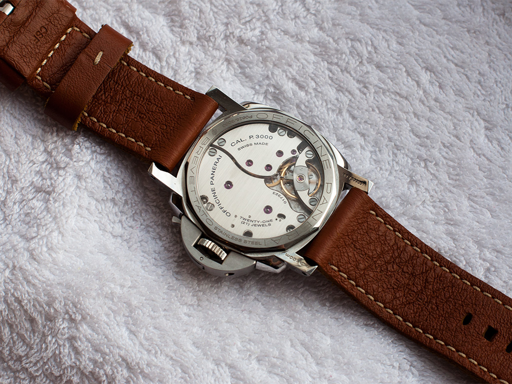 Механизм: Механический с ручным заводом, калибр Panerai P.3000, производство Panerai, 16½ линий, толщина 5,3 мм, 21 камень, балансир Glucydur®, 21 600 полуколебаний/час. Противоударное устройство Incabloc®. Запас хода 3 дня, два заводных барабана. 160 деталей.