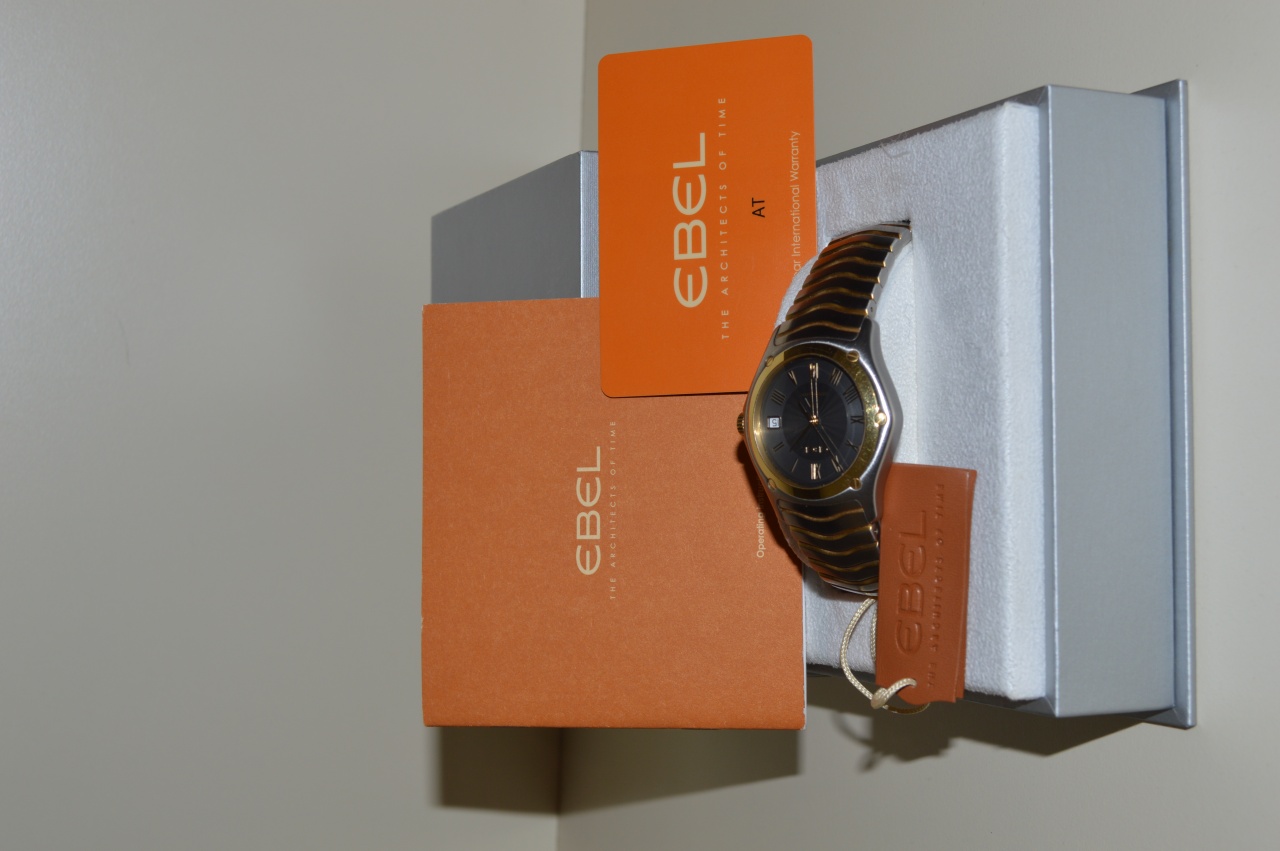 Классические мужские часы Ebel Classic Wave, с автозаводом. Покупались у дилера в США в начале 2011 года. Пользовался ими в течении пары месяцев, после покупки, остальное время лежат в коробке, продаю за ненадобностью. Безель выполнен из золота 750 пробы, корпус и браслет- из высокопрочной стали с качественным золочением.