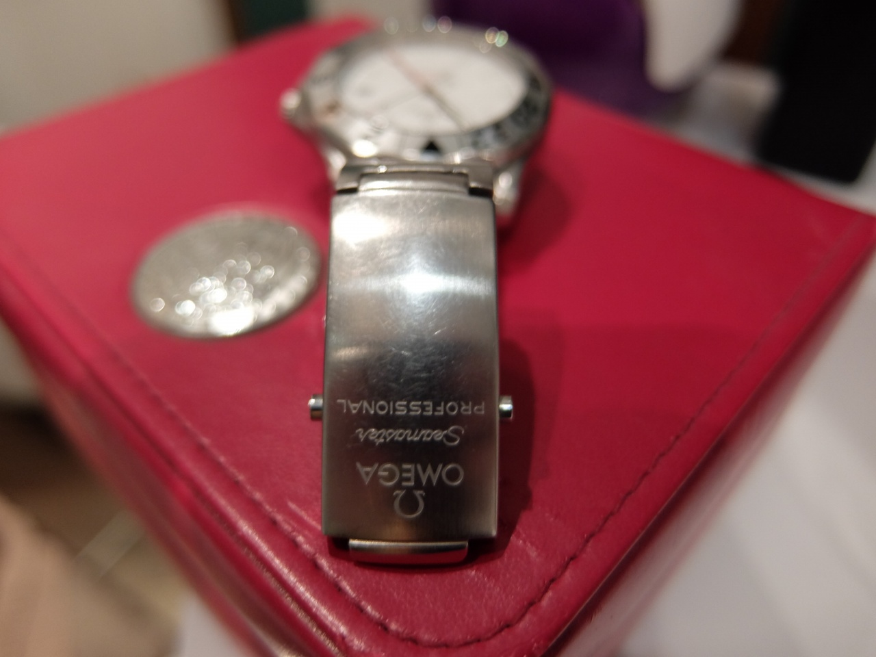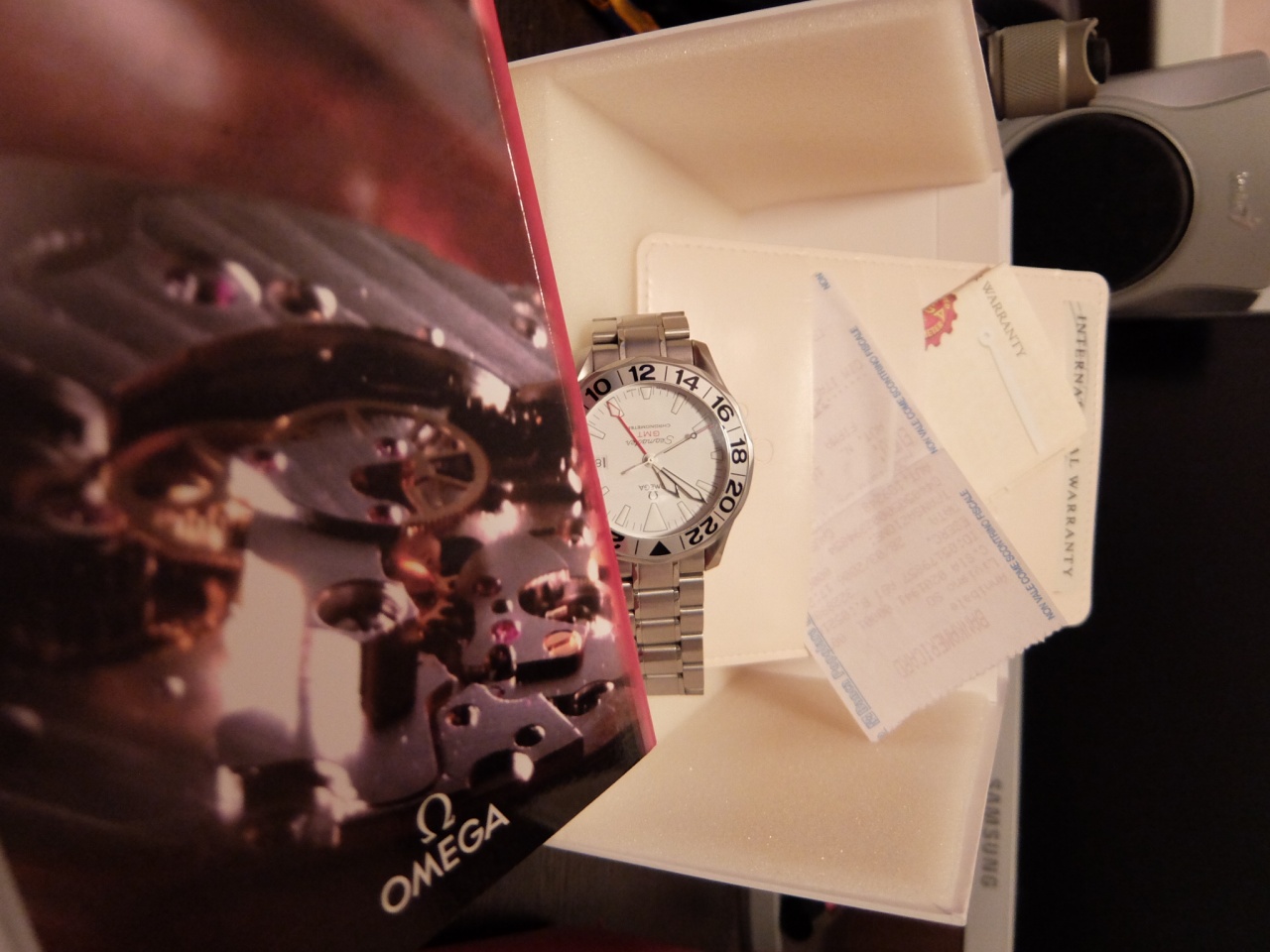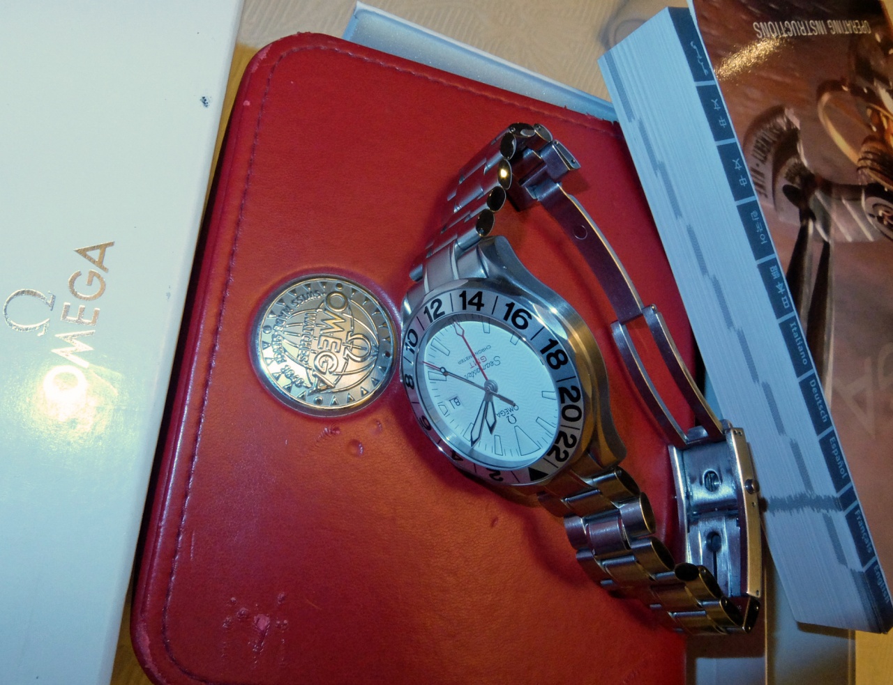 Все документы, коробки, чеки, звенья браслета в наличии. Красная коробка несколько потерта из-за перевозок (перемещал ценное на время отпусков). Часы в очень хорошем состоянии: на корпусе, стекле, безеле и браслете царапин нет, есть потертости и одна царапина на пряжке браслета. На безеле есть дефект в районе цифры 16 (см. фото). "На 10 часов" на нижней грани так сказать "микровдавочка"