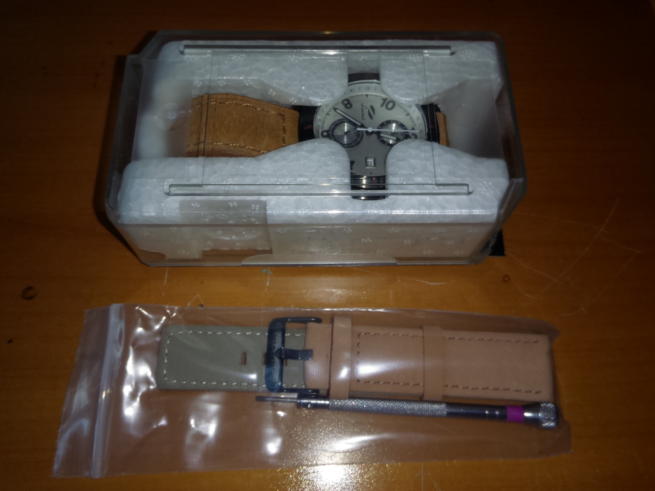 Часы пришли в прозрачной коробке, надёжно закрепленные вспененным пластиком. Часы на ходу, в рабочем состоянии. Корпус часов действительно похож на сталь - безель и верх имеют черненое браширование. Стекло, видимо недорогое, как будто бы даже и не кристально прозрачное. Циферблат имеет цвет алюминия с теплым оттенком и мелко зернистой структурой поверхности, обозначения цифр нарисованы краской, есть накладные элементы на малых циферблатах. Стрелки имеют люм, но не мощный, светятся бледно зеленым. Окошко даты оформлено с претензией на аккуратность. Механизм работает уверенно, кнопки выполняют все свои функции, запускается секундомер. Ремешок установленный на часах сделан из трехслойной кожи, на вид не дешевый, толщиной 3,5-4мм, но коротковат для меня, хотелось бы ещё 1,5-2см. длины. Но продавец заботливо приложил ещё ремешок, попроще и потоньше, а к нему отвертку для замены. Всё удовольствие обошлось в 3600р. Ближайший конкурент по моделям со сходным качеством изготовления это Stuhrling, но ценник будет выше в 2-3 раза. Часы рекомендую для любителей подобных моделей.