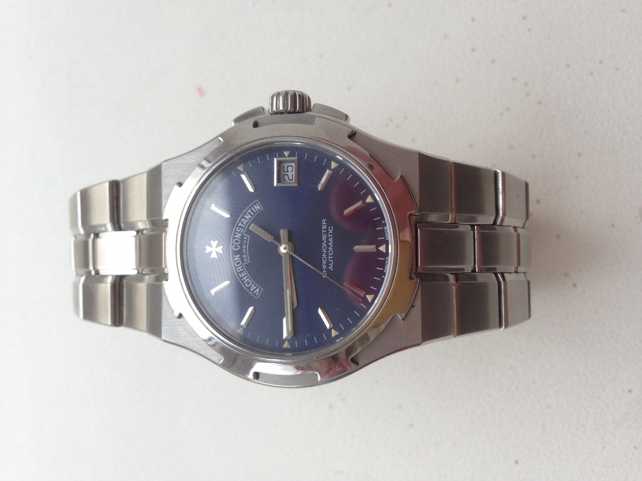 Vacheron Constantin Overseas Chronometer реф: 42042 синий циферблат, 37мм с выступами 39мм смотрятся как Rolex Daytona , на полном браслете. Часы не полированы, состояние идеальное, нет потертостей, царапин и каких либо следов носки, вобщем