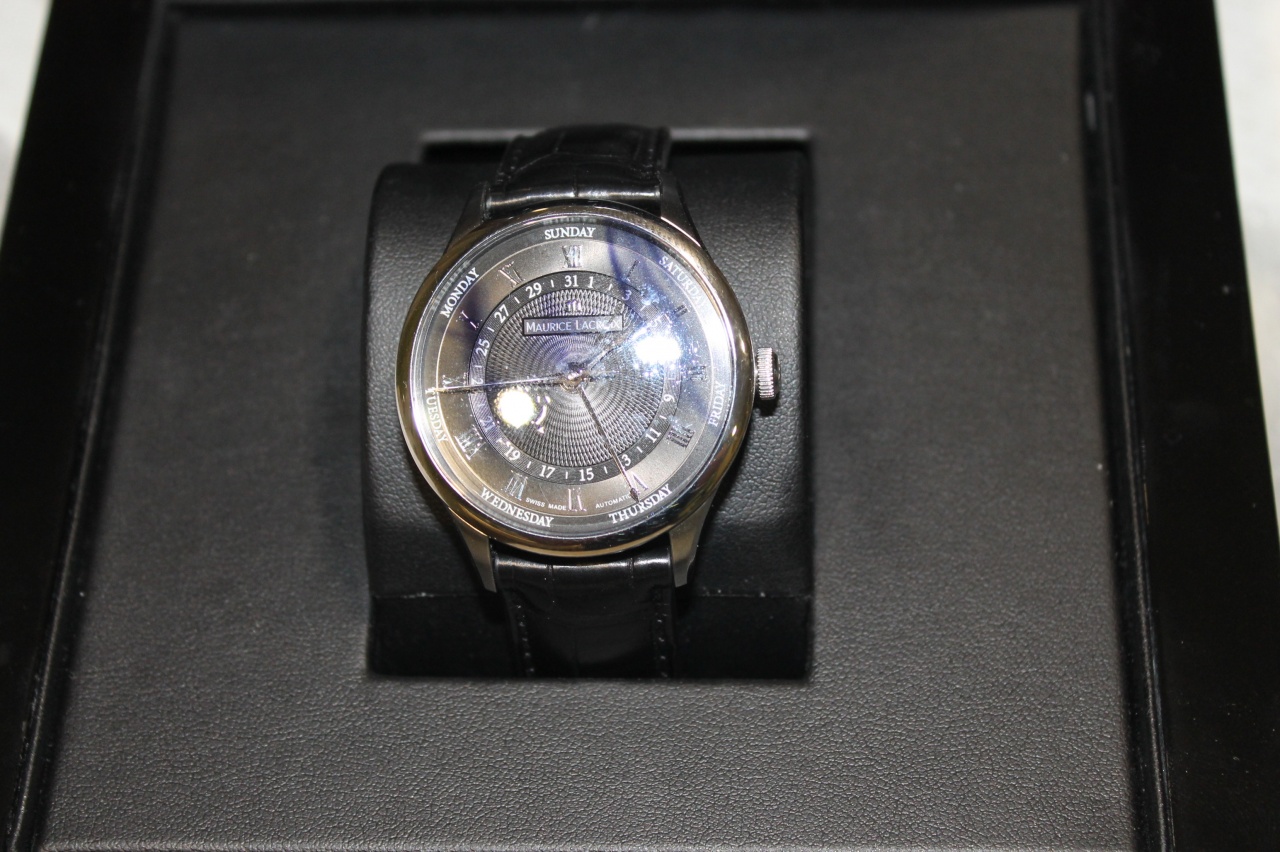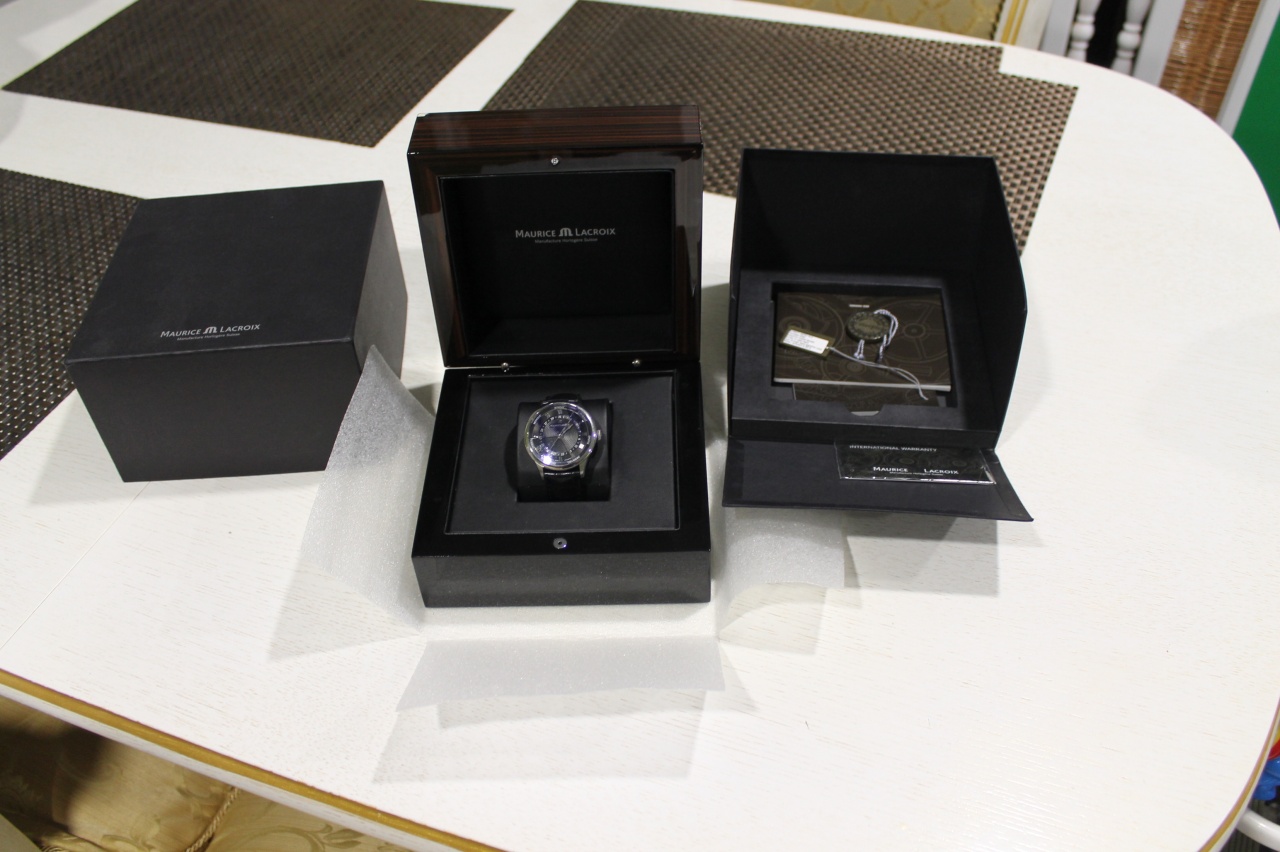 В механизме 26 камней, частота 28800 полуколебаний в час. Запас хода 38 часов. Сапфировое выпуклое стекло с двусторонним антибликовым покрытие. Дата и день недели отображаются центральными стрелками. Гильошированный циферблат. Завинчивающаяся задняя крышка с сапфировым стеклом. Ремешок из кожи крокодила. Диаметр корпуса 40 мм.Водонепроницаемость до 50 м (5 атм).