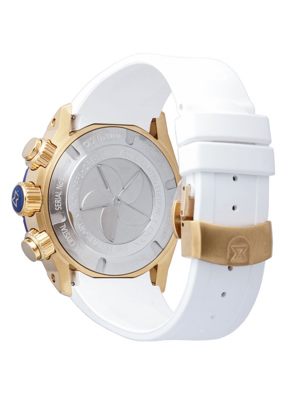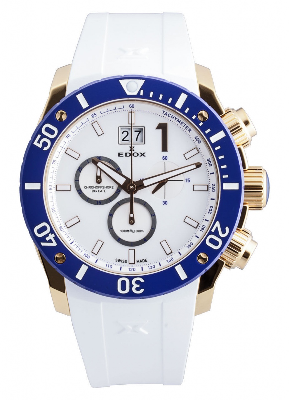 Мощный катер с двигателем V12 или V8 может достигать на воде скорость до 257 км/ч, морские гонки - это спорт, где мужество, выносливость, мастерство и грамотный расчет времени – основные составляющие успеха. Производство часов Chronoffshore 1 послужило началом успешного сотрудничества компании Edox с миром спорта, так она стала официальным хронометристом чемпионата по морским гонкам Chronoffshore 1. Чтобы отметить 10-летие своей коллекции Chronoffshore 1, Edox выпустил