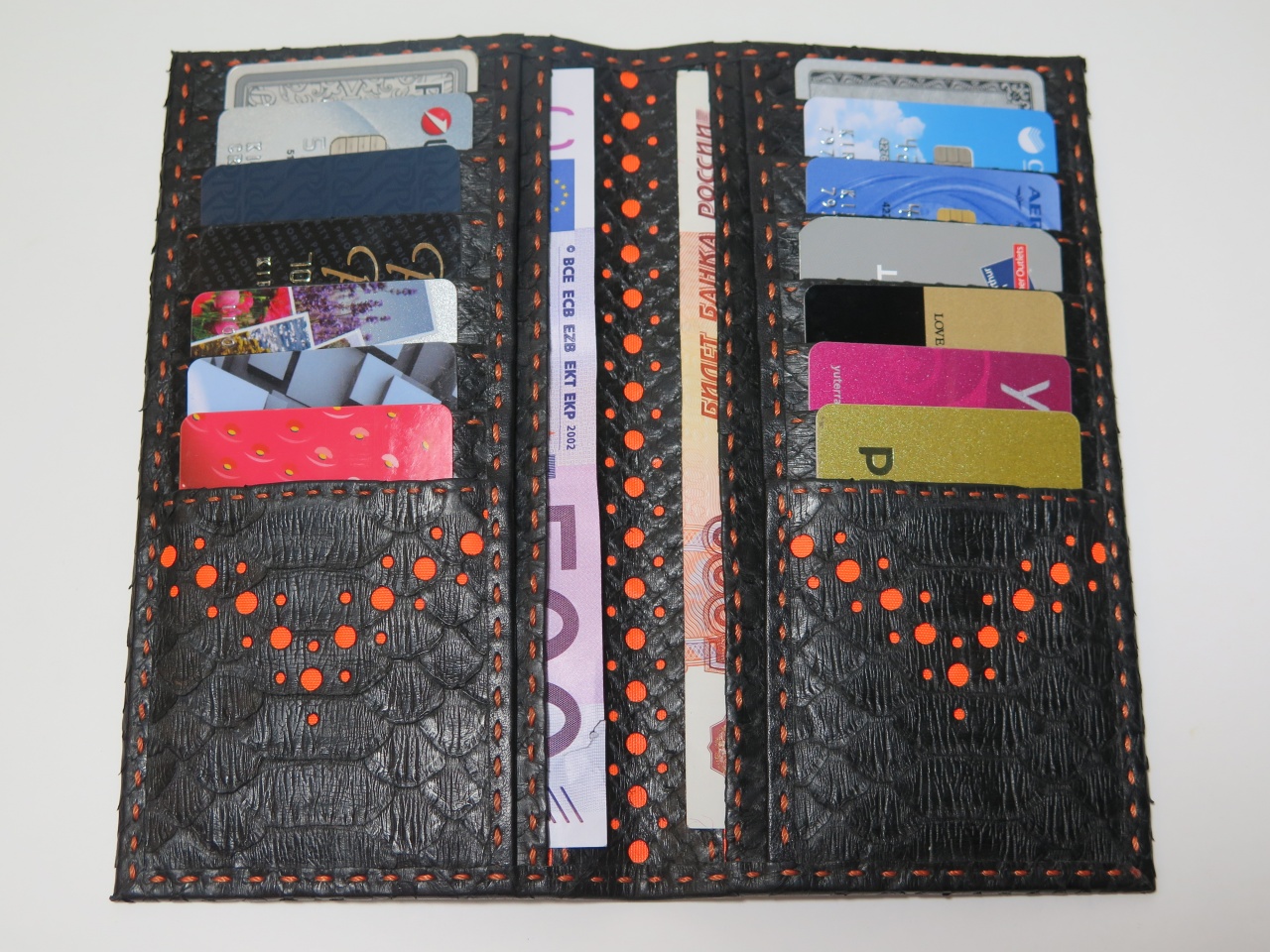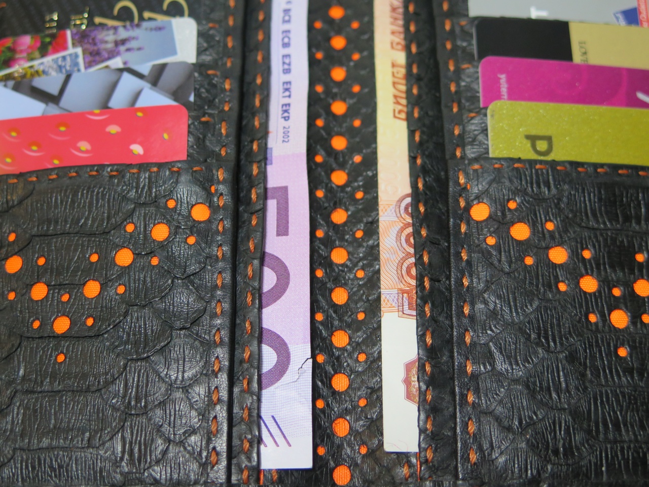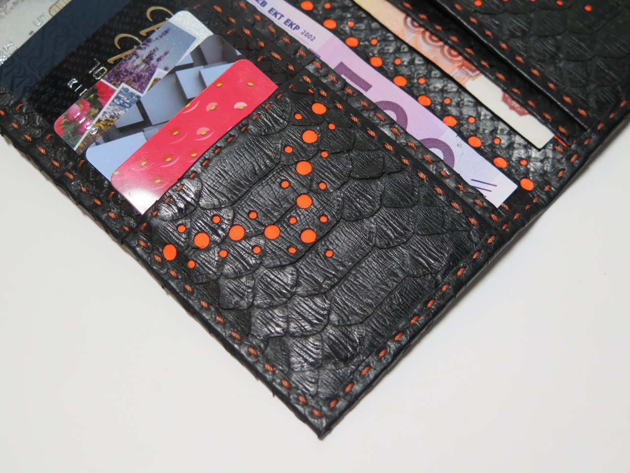 Уникальной особенностью портмоне является его внутренняя отделка также из кожи питона, подложка из ткани оранжевого цвета, эксклюзивная перфорация и декоративная прошивка вручную нитью оранжевого цвета.