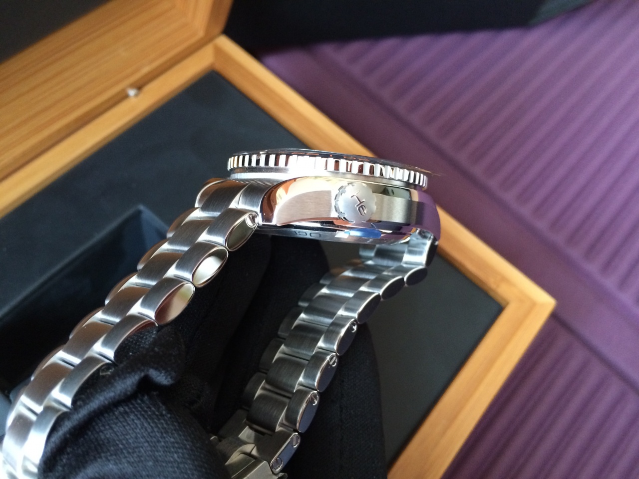 хронометр C.O.S.C., индикация даты, индикация второго часового пояса отдельной стрелкой, гилиевый клапан, завинчивающаяся заводная головка, прозрачная задняя крышка, вращающийся безель.