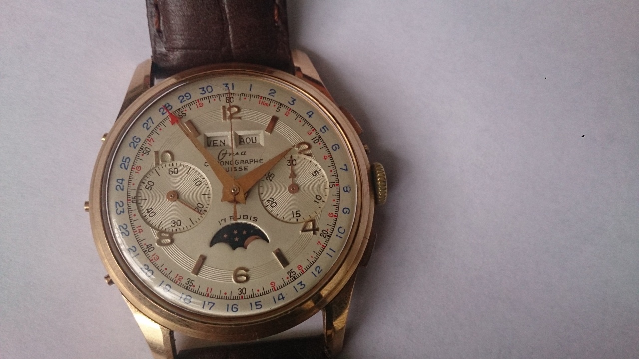 Продается раритетный золотой (18К - 750 проба) хронограф с полным календарем и лунником. Калибр Landeron 186 с ручным заводом. Часы и хронограф на ходу, ходят точно, календари работают. Состояние очень хорошее. Дата производства где-то между 1940 - 1950г.