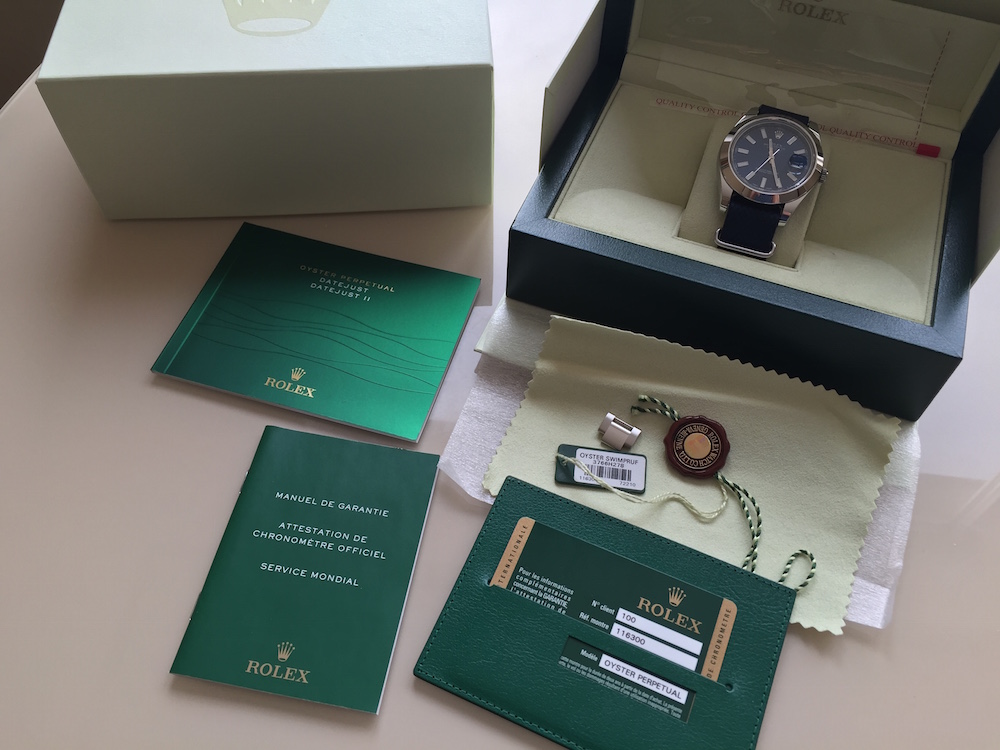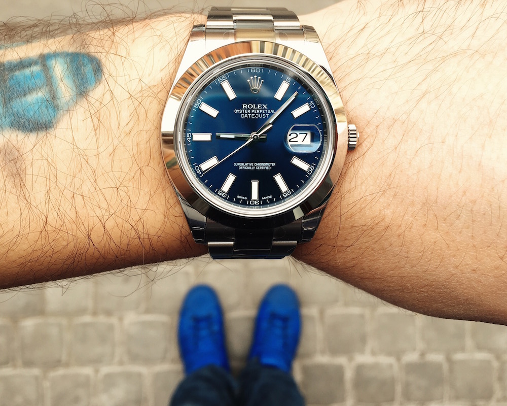 В какой-то момент наткнулся на ROLEX DateJust II Blue dial в аэропорту Парижа. запали в душу. Мне в принципе очень нравится все синее, а в этой модели синий циферблат получился невероятно красивый, с металлическим отливом. Понравился вариант с меткам - палочками. Ничего лишнего.