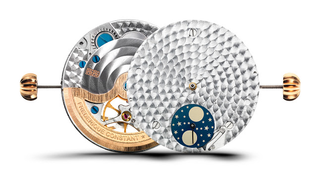 Модель оснащена мануфактурным швейцарским автоматическим механизмом Frederique Constant FC-715, с балансовой частотой 28800 полуколебаний в час (4 гц), запасом хода 42 часа, функциями индикации часов, минут (посредством соответствующих центральных стрелок), даты (посредством круглого аналогового указателя с цифровой разметкой, расположенного на 6 часах) и фаз Луны (посредством соответствующего указателя, расположенного на 6 часах и регулируемого через заводную головку). Калибр отлично отделан и декорирован.