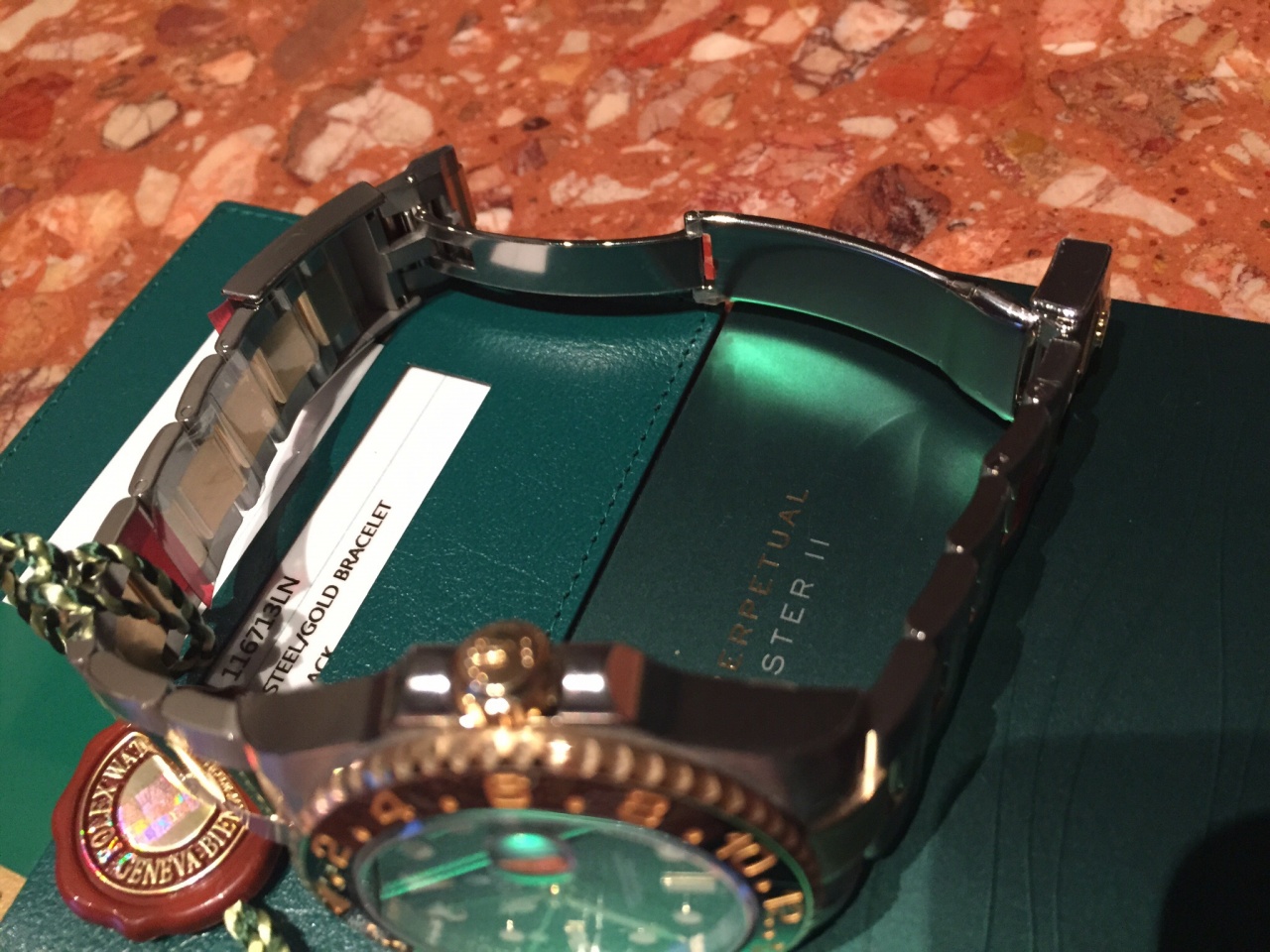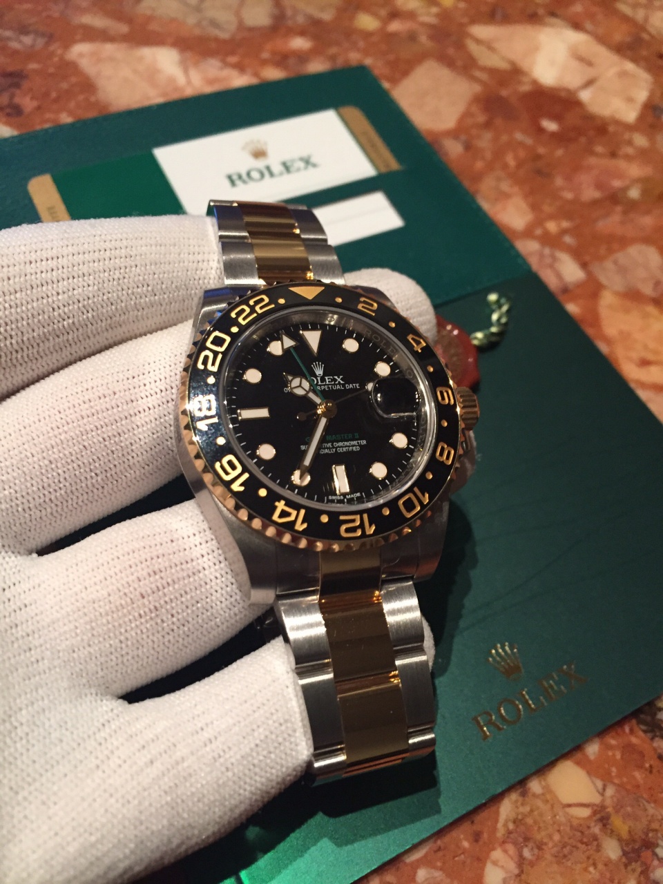 Завод часов Автоматический подзавод в двух направлениях с помощью ротора Perpetual, Браслет Oyster, плоские трехрядные звенья, Материал браслета Желтый Rolesor (сочетание стали 904L и 18-каратного желтого золота), Застежка безопасности Oysterlock с раскладывающейся пряжкой и удлиняющим до 5 мм звеном Easylink, Циферблат Черный, Торга нет. Естественно полный комплект. В наличии. В Москве.
