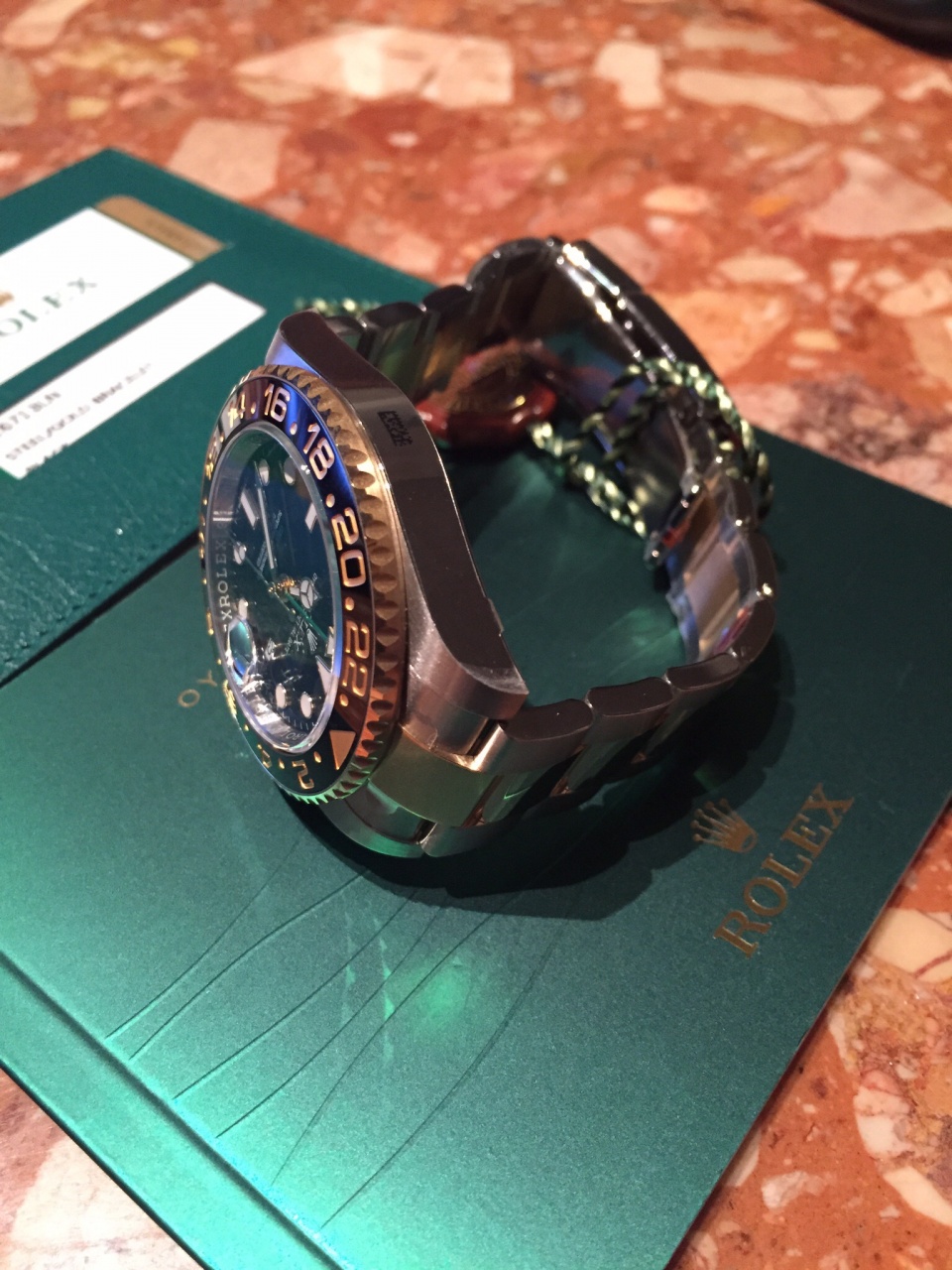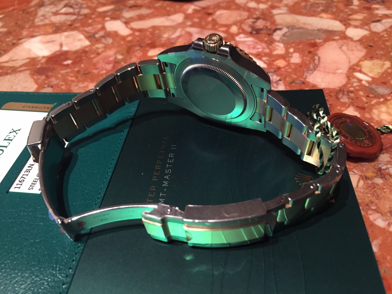 Механизm Perpetual, автоматический подзавод, функция GMT, Калибр 3186, производство Rolex, Функции Центральные часовая, минутная и секундная стрелки. 24-часовая индикация времени. Второй часовой пояс с быстрой и независимой регулировкой часовой стрелки. Мгновенно устанавливаемая дата. Возможность остановки секундной стрелки для выставления точного времени, Точность Сертификат COSC, Осциллятор Синяя парамагнитная спираль Parachrom,