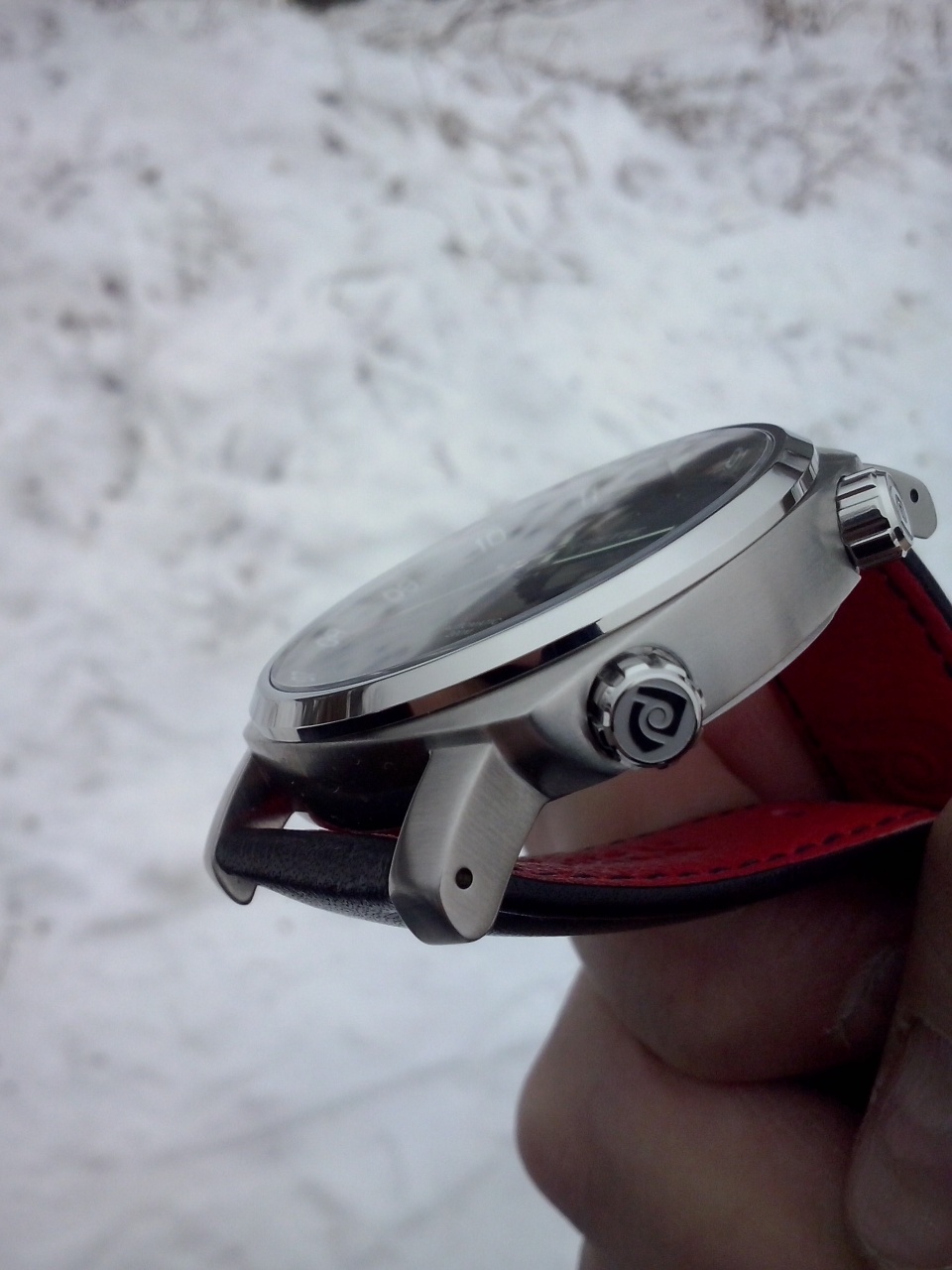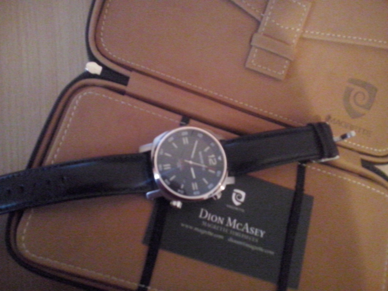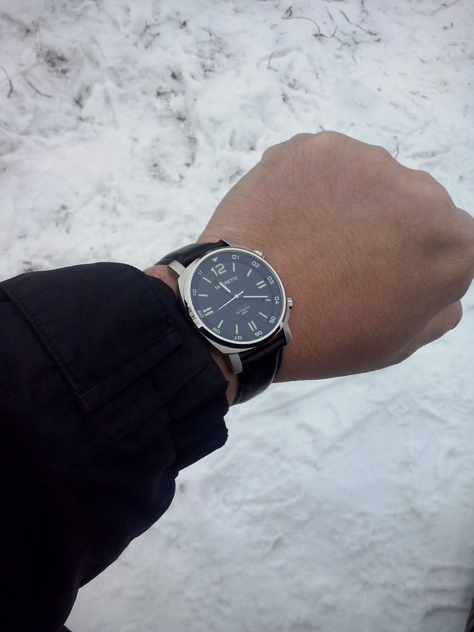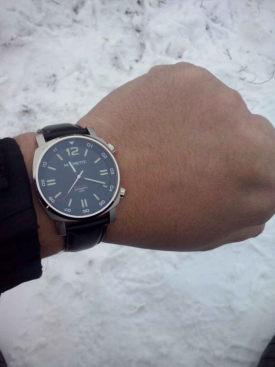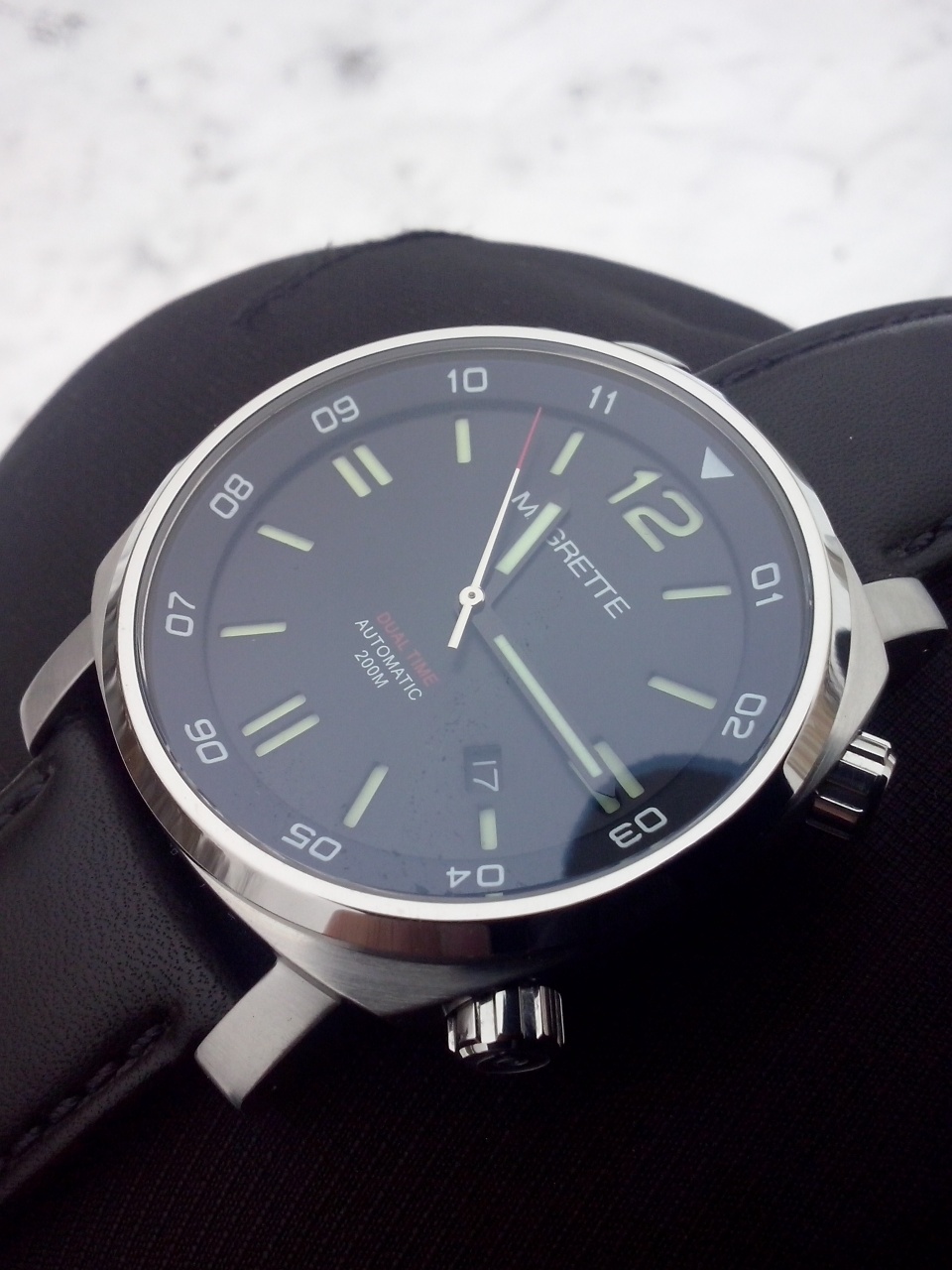 Продаю в Москве Magrette Dual Time в черном цвете (всего выпущено 500 экз). Механика (внутри Miyota (Citizen) 9015). Сталь. Диаметр 42мм без головок. Выпуклый сапфир с внутренним антибликовым покрытием. Циферблат сэндвич. Ремешок из кожи с оригинальной баклей. Водозащита 200м. Обе головки закручиваемые.