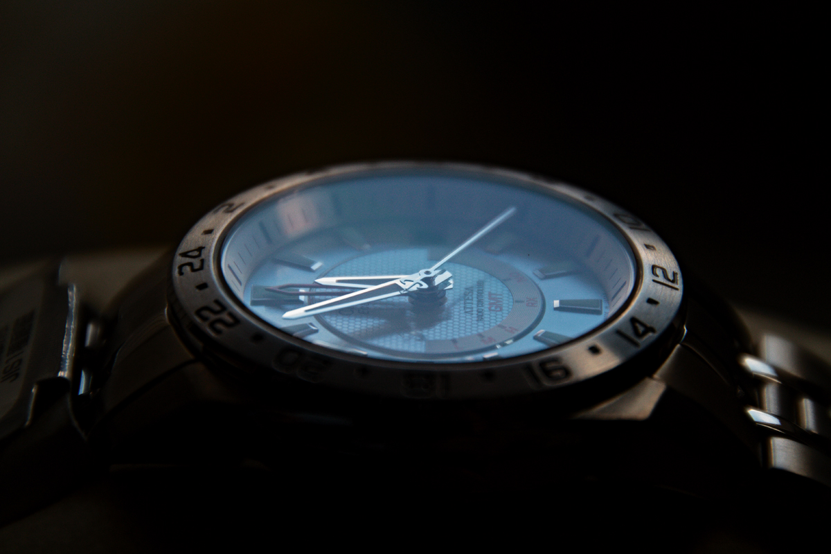 Но стоит только немного повернуть, чтобы свет по-другому упал, и ощущение, что циферблат просто светиться начинает. На WUS, кажется, кто-то сравнивал это с полированной керамикой, не знаю, интересно было бы попробовать с поляризационным фильтром это сфотографировать. Не блестит, не сверкает, а именно светиться, причём уходит почему-то в синюю часть спектра. Особенно хорошо это заметно на фоне тёплых цветов внутреннего безеля, который становится ближе к золотому и покрытия на титане, отсвечивающего пурпурным.