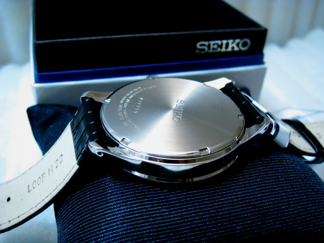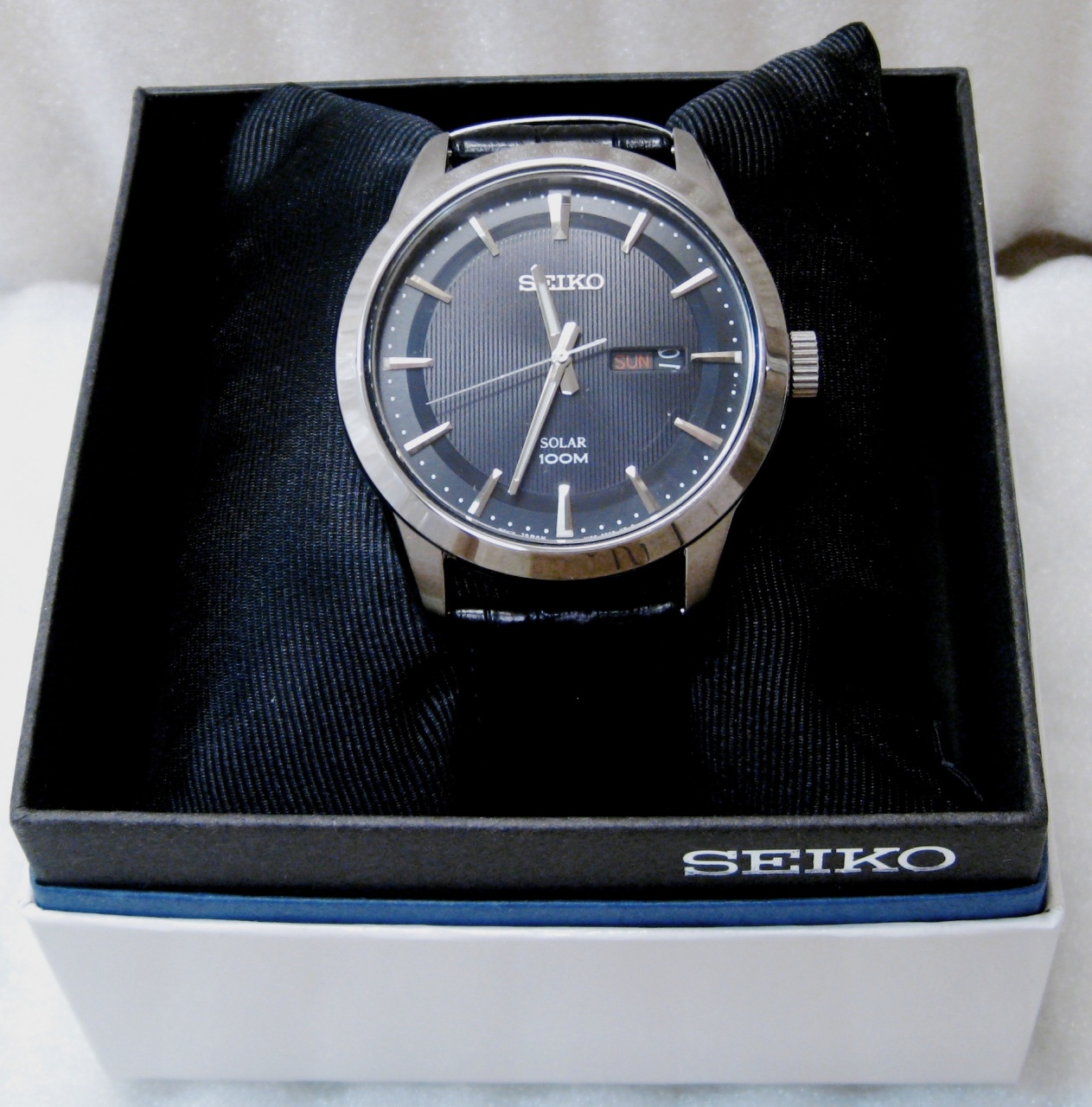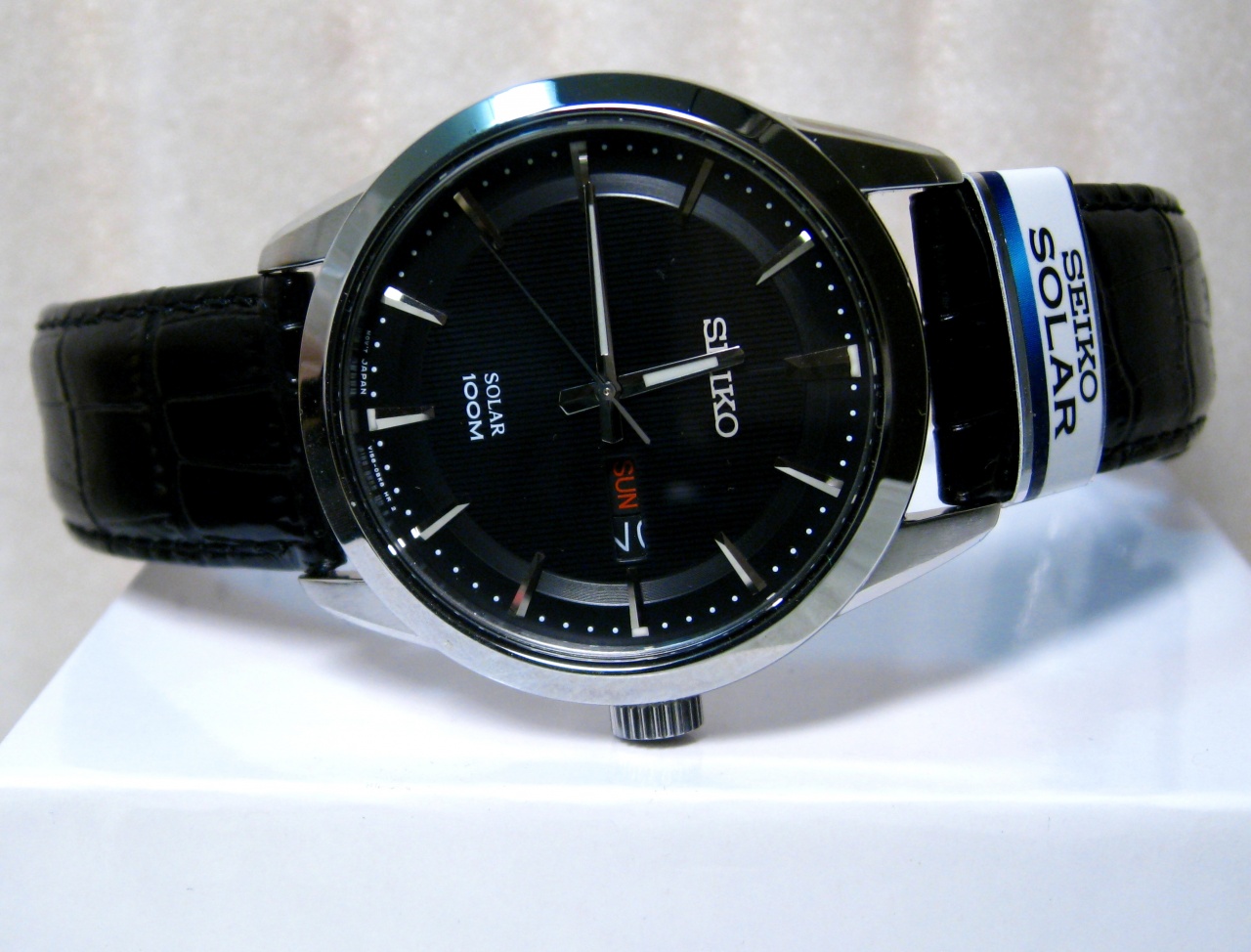 SEIKO SOLAR. Трёхстрелочник на чёрном кожаном ремешке.