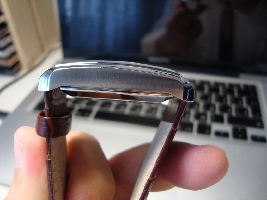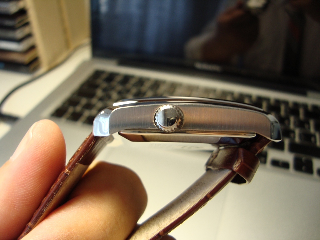 Корпус часов выполнен из комбинации участков сатинированной и полированной стали. Боковые стороны корпуса и поверхности ушек и тонкая проточка между ними сатинированы. Остальные участки полированы. Со стороны крышки все поверхности полированы. Заводная головка без логотипа, смещена вниз и под углом. Сделана аккуратно. Вытаскивается без особых усилий (на Востоке-Мегаполисе головку без помощи пинцета до сих пор не вытянуть, поэтому и обращаю здесь внимание на такую мелочь). Вытягивается в два положения до первого щелчка (в этом положении выставляется дата) и до второго щелчка (в этом положении выставляется день недели и время).