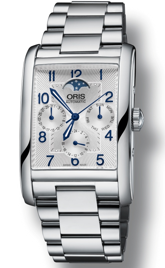Новая модель Rectangular Complication (Ref. 582 7694 4031) от швейцарской часовой компании Oris имеет многокомпонентный полированный прямоугольный корпус, изготовленный из нержавеющей стали, длиной 47,0 мм, шириной 32,0 мм, водонепроницаемый до 30 метров. На торце рифленой заводной головки, расположенной на 3 часах, выгравировано наименование бренда Oris. Сапфировое стекло установлено на передней стороне часового корпуса (выпуклое, с внутренним антибликовым покрытием) и на его завинчивающейся задней крышке. Серебристый гильошированный циферблат с накладными синими арабскими цифрами и с синими стрелками (в том числе - часовой и минутной мечевидной формы, покрытыми люминесцентным составом Super-LumiNova белого цвета.