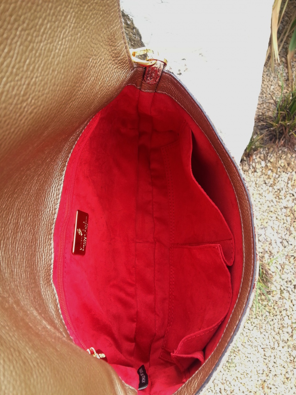 Внутри сумка отделана замшей красного цвета и имеет два кармашка под смартфон и небольшие вещи, и карман для документов на молнии с позолоченным бегунком.