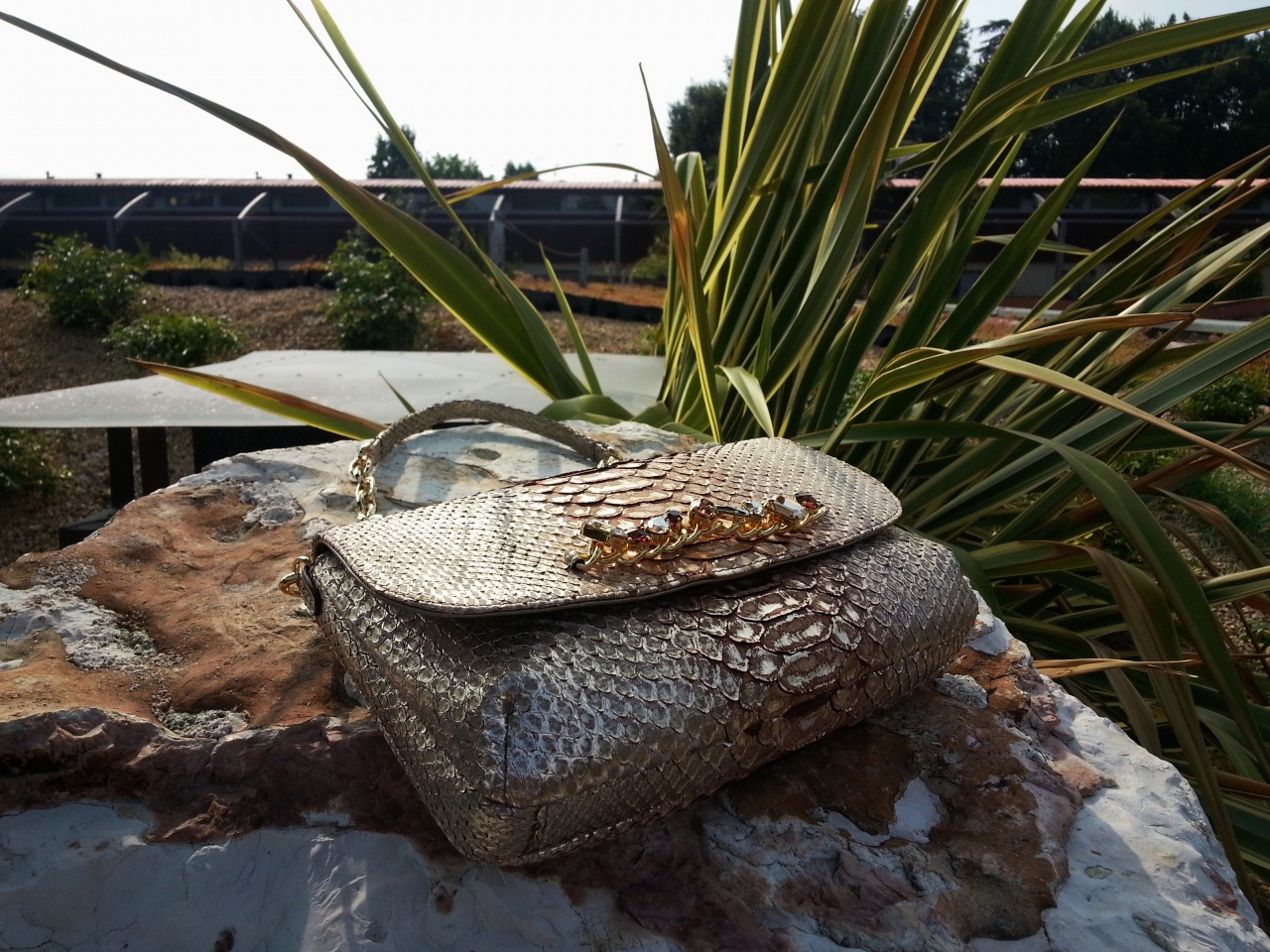 Изготовлена из 100% кожи анаконды высочайшего качества выделки, окрашенной вручную в насыщенный, очень красивый цвет - серебристо-золотистый с эффектом паттинирования и градиентным окрасом.