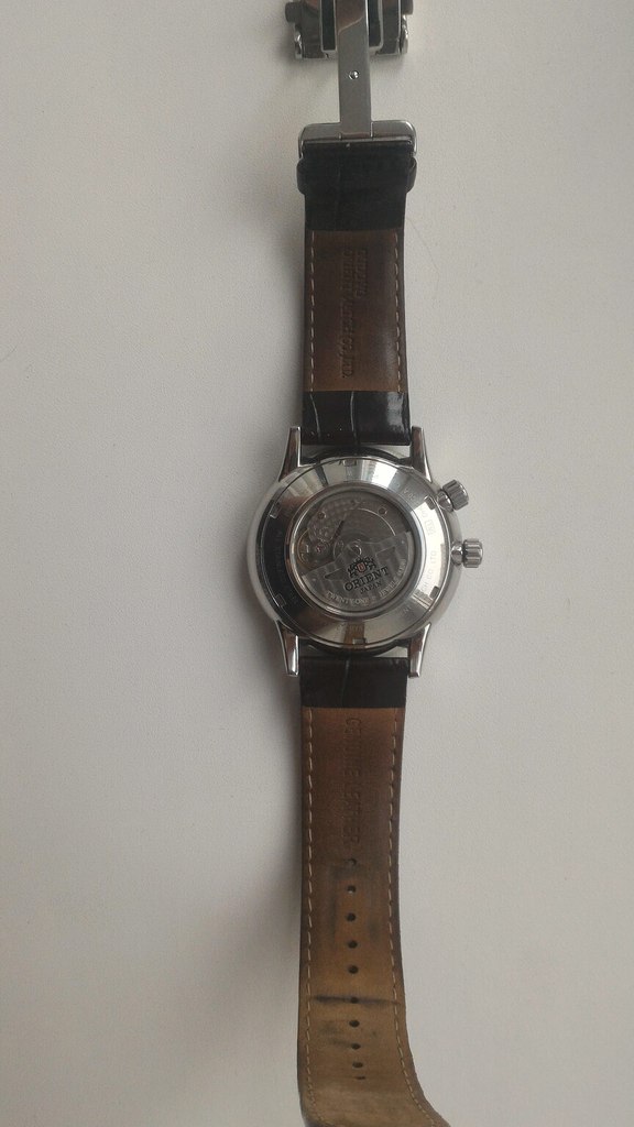 Часы Orient. Механика с автоподзаводом, водонепроницаемые, противоударные, сапфировое стекло с антибликовым покрытием (не царапается), прозрачная задняя крышка,люминесцентное покрытие стрелок и цифр (светятся в темноте). Покупались в марте в офф магазине Orient (все еще на гарантии). Все документы, коробка в наличии. Состояние отличное, за исключением потертости на ремешке(на последнем фото видно), но эта проблема у всей модели.