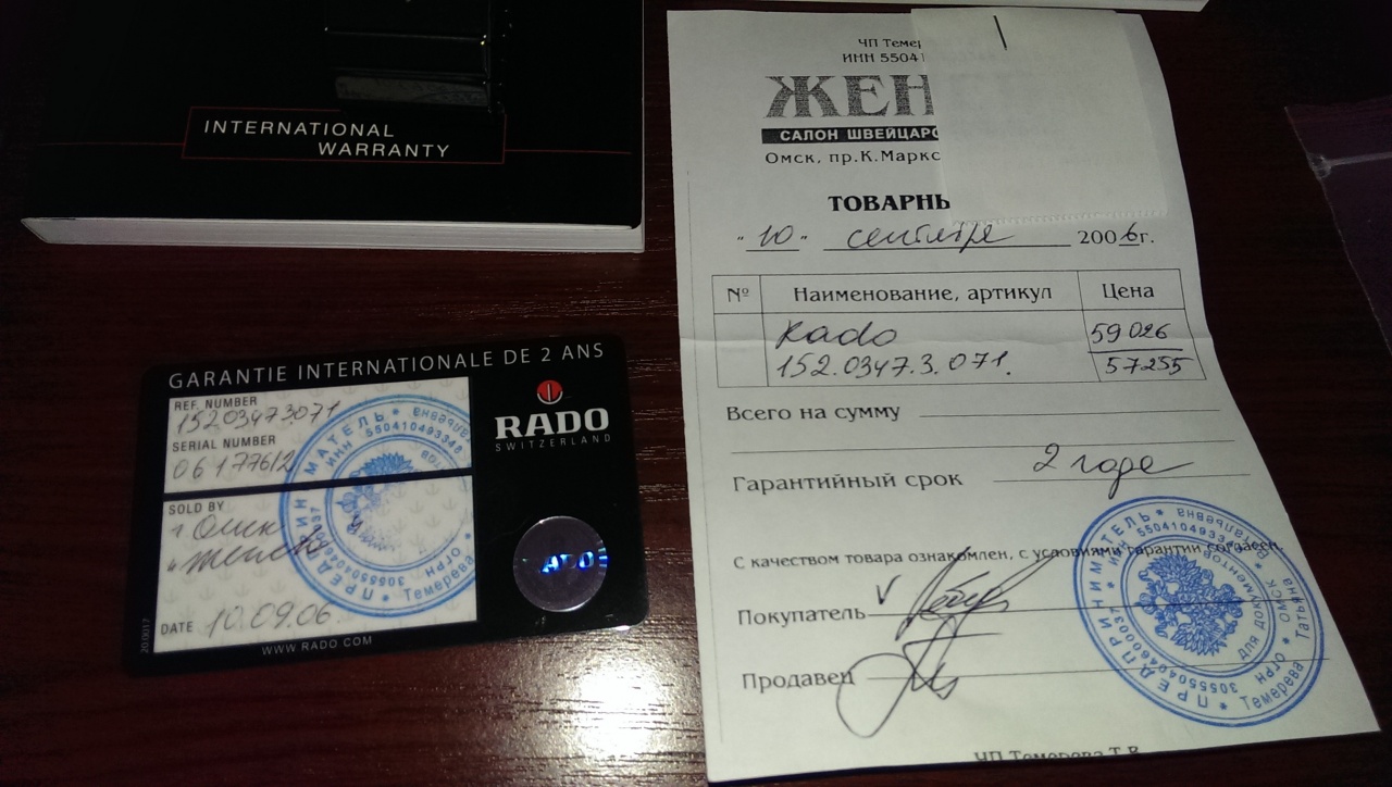 Часы с полным комплектом, а именно: картонная коробка, дорожный кейс, инструкция, гарантийный талон (карточка), гарантийный талон из магазина, чек на покупку (не много выцвел, но цифры видны).